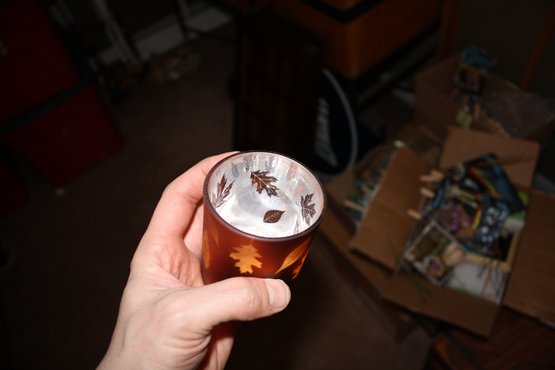 Electroplated glass tea light candle holder featuring an autumn-inspired leaf motif. Designed to hold a standard tea light candle, adding a warm, seasonal decorative accent to tables, shelves, or mantel displays. Ideal for fall or Thanksgiving décor.