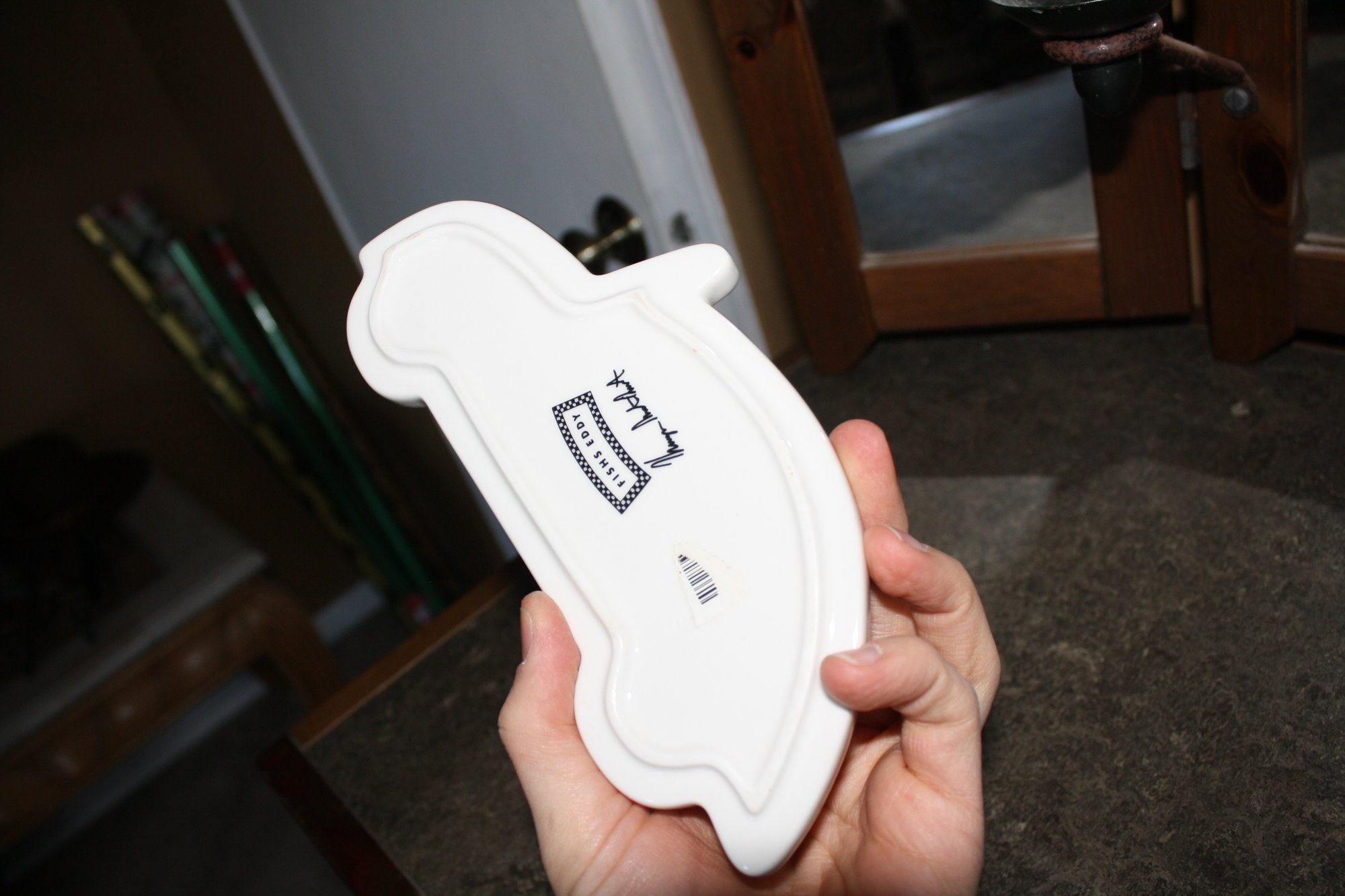 Collectible white ceramic pin dish by Fishs Eddy featuring a watercolor-style illustration of a blue Volkswagen Beetle. The small tray is shaped to resemble the classic VW Bug design and is stamped “Fishs Eddy” on the underside with a signature mark. Crafted from ceramic, it can be used as a pin dish, tea bag holder, key tray, or small decorative catchall. Approximate size about 21 cm wide and 10 cm tall.
