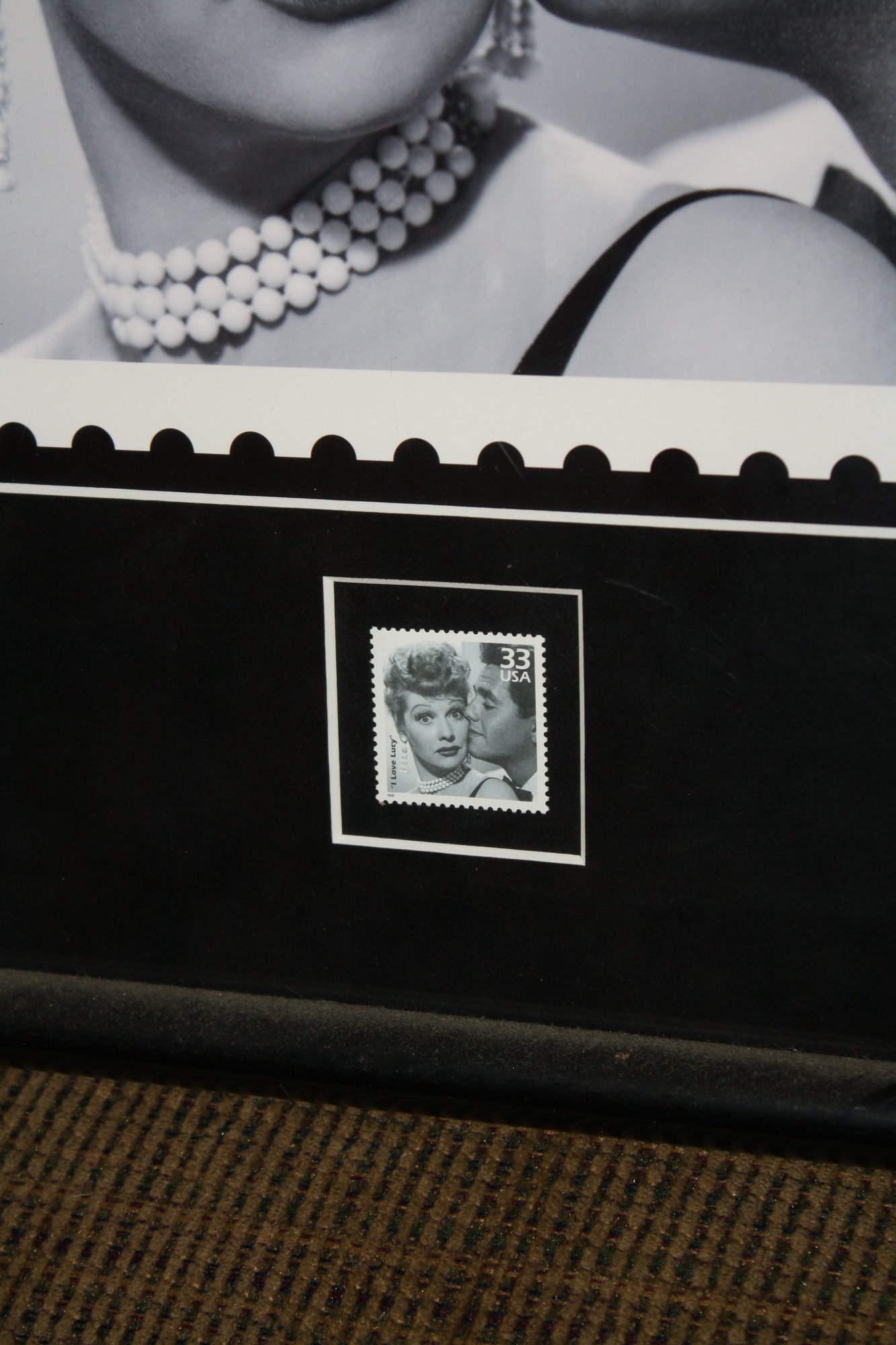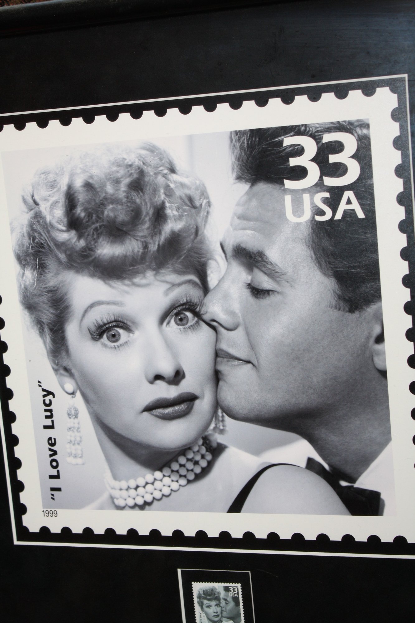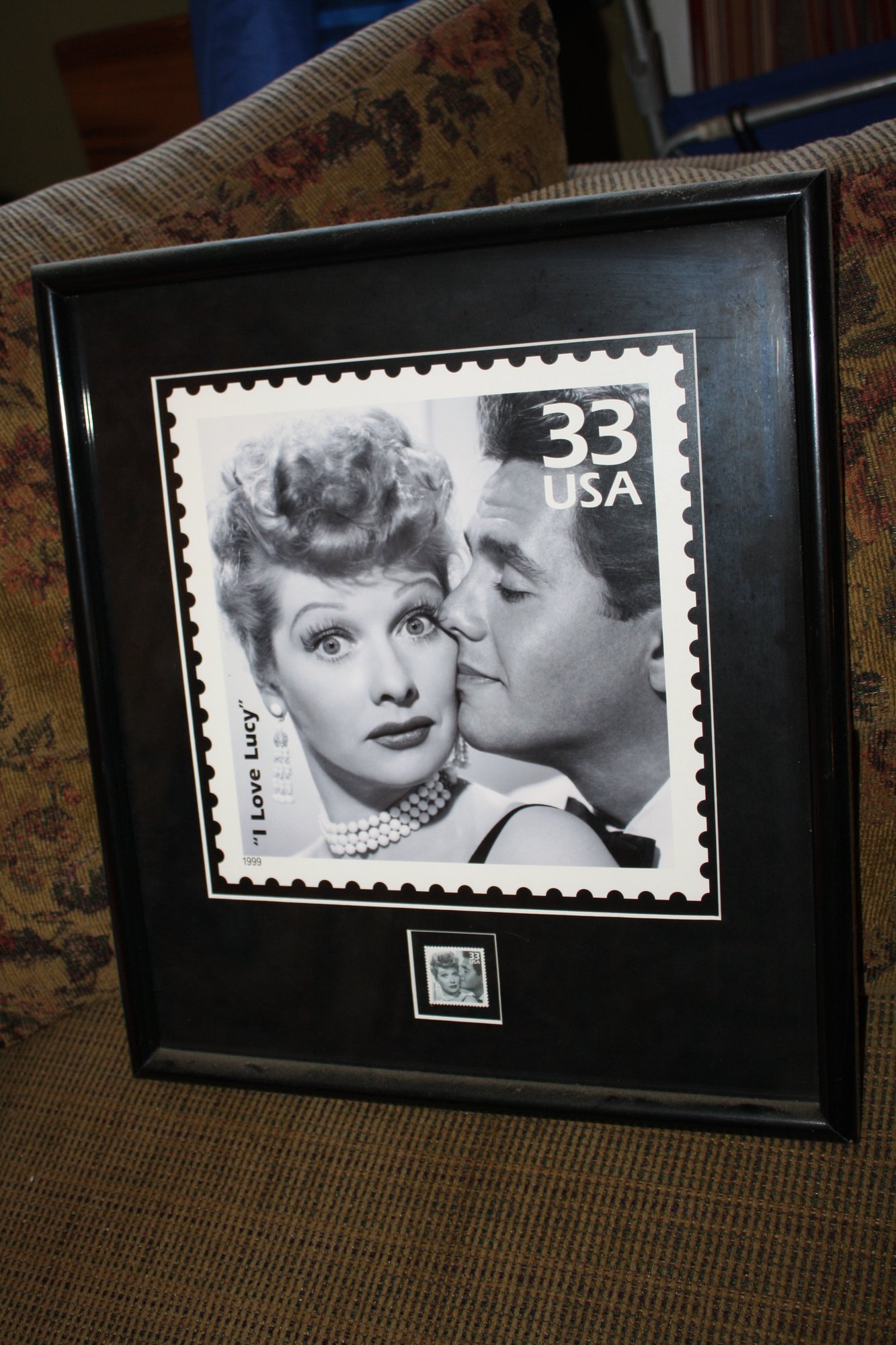 Framed 1999 United States postage stamp commemorating the classic TV show I Love Lucy, starring Lucille Ball and Desi Arnaz. The collectible stamp has a face value of 33ยข and is displayed in a 14-inch-wide frame. Ideal for collectors, fans of classic television, or decorative display.