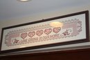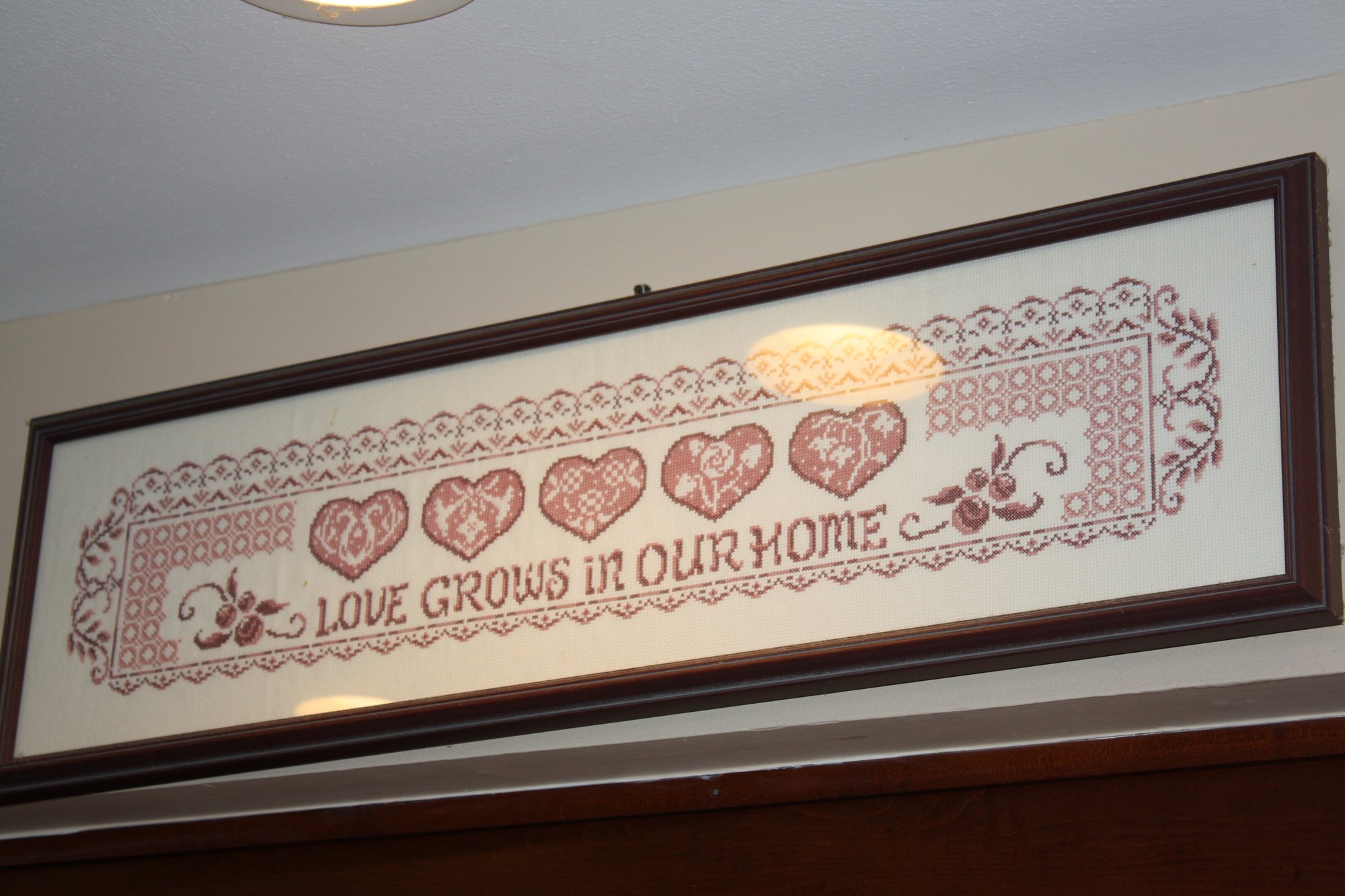 A 31-inch long framed counted cross-stitch sampler featuring decorative hearts and the phrase "LOVE GROWS IN OUR HOME," crafted with detailed embroidery and displayed in a simple frame for wall decoration.