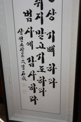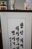 This is a framed Korean calligraphy panel featuring traditional brushwork on paper or silk. The piece showcases elegant Korean script and artistic composition, making it a decorative collectible suitable for display in homes, offices, or galleries. 30"tall