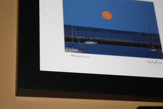 This framed art print titled Provincetown by Tom Johanson features a serene coastal harbor with boats beneath a large orange moon, capturing a supermoon or harvest moon effect. Signed on the matting, the print is framed in a black frame with a white mat border, perfect for home décor, office spaces, or art collections. 12' wide