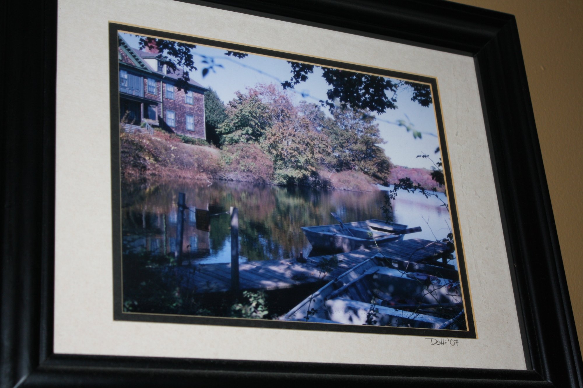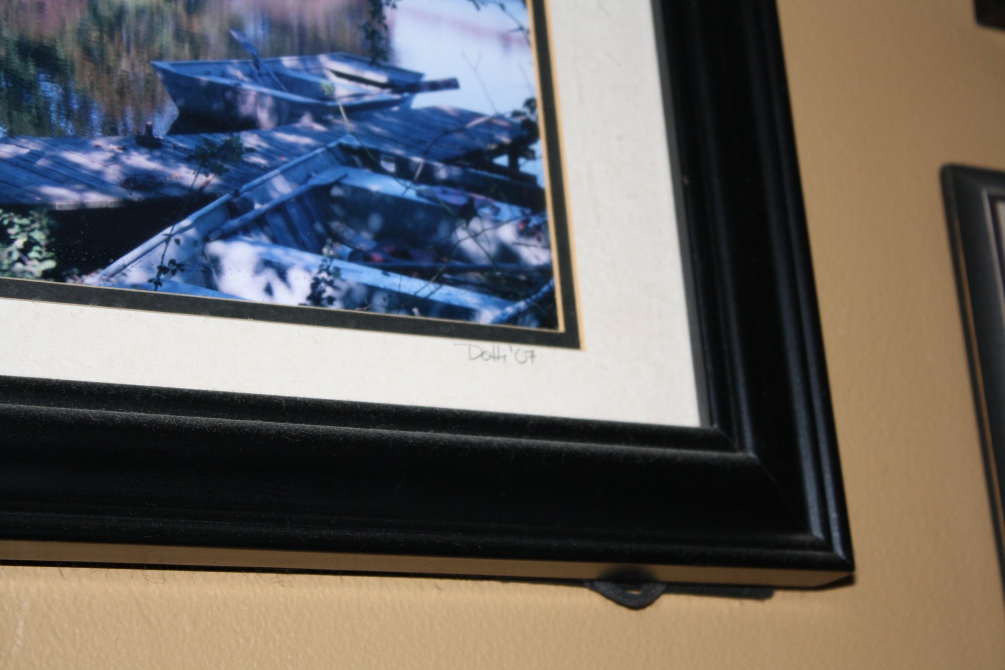Framed landscape artwork depicting a calm river scene with boats docked at a small pier and a house on the bank. Signed and dated “Dotti ’07” in the bottom right corner. Presented in a black frame with a light mat board, evoking tranquil reflections on water. Ideal for rustic or nautical-inspired home décor. 15" wide
