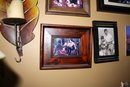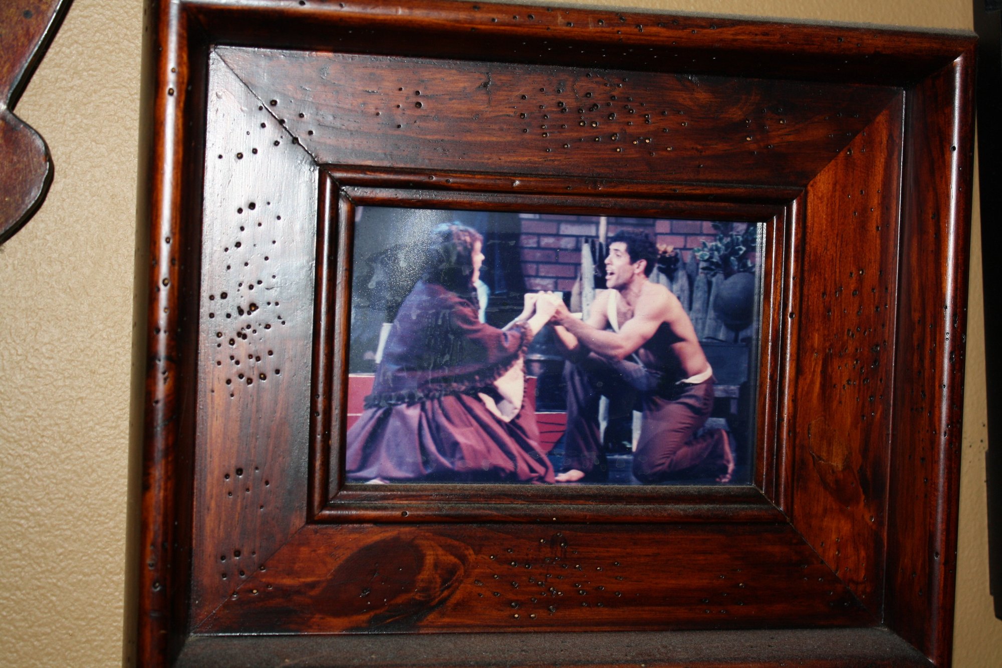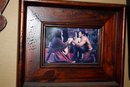 Framed photograph depicting a dramatic scene from a musical or theatrical production. Dark rustic wood frame with textured detailing. Features two actors on a dimly lit brick-set stage, capturing an intimate or pivotal moment. Ideal for theater enthusiasts or as a collectible display piece.