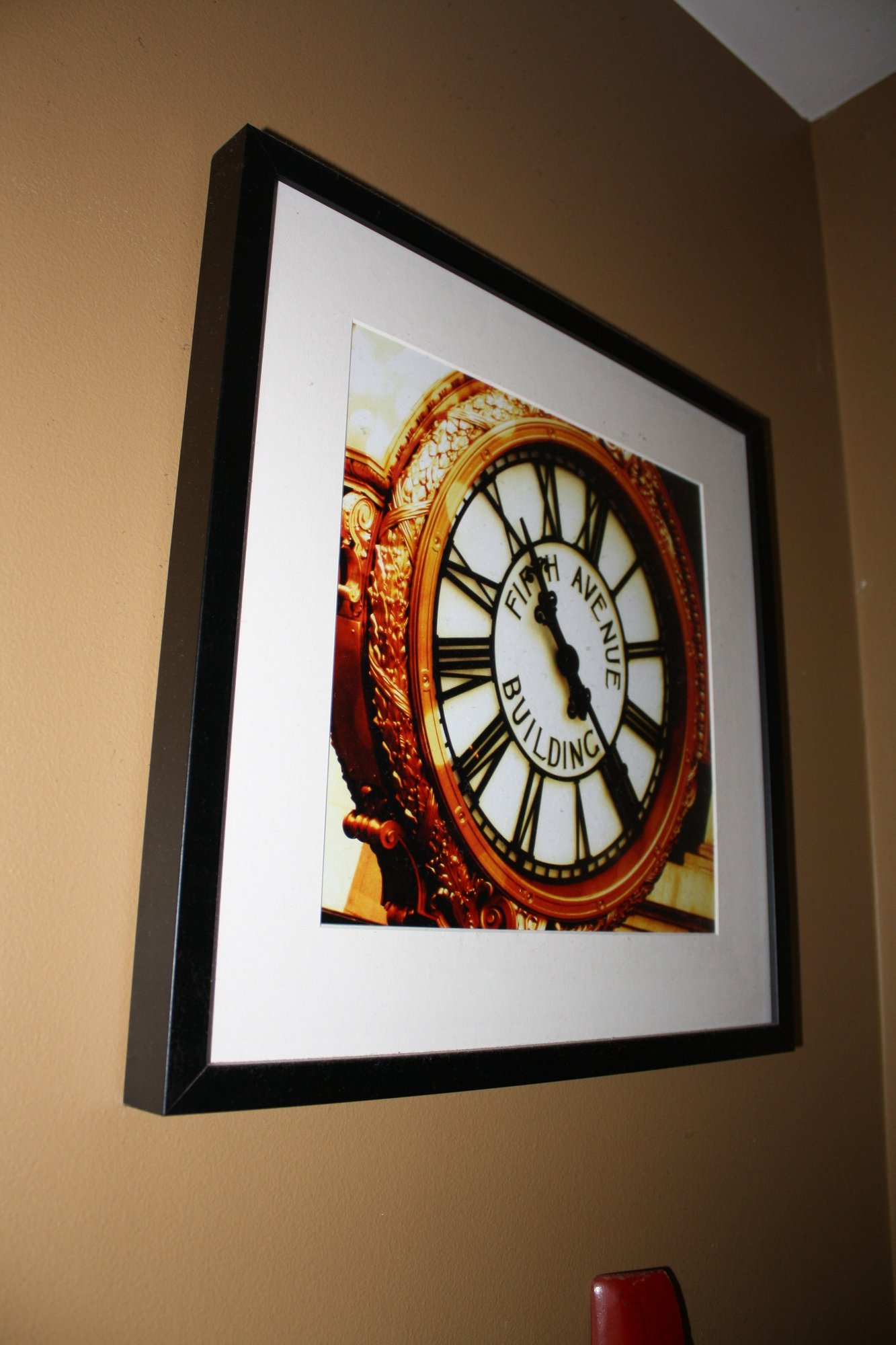 This framed wall clock features a vintage design with "FIFTH AVENUE BUILDING" text and an antique-style clock face with Roman numerals. It is set in a simple black square frame with a white mat, making it a stylish decorative piece suitable for homes, offices, or cafe interiors. 18" tall