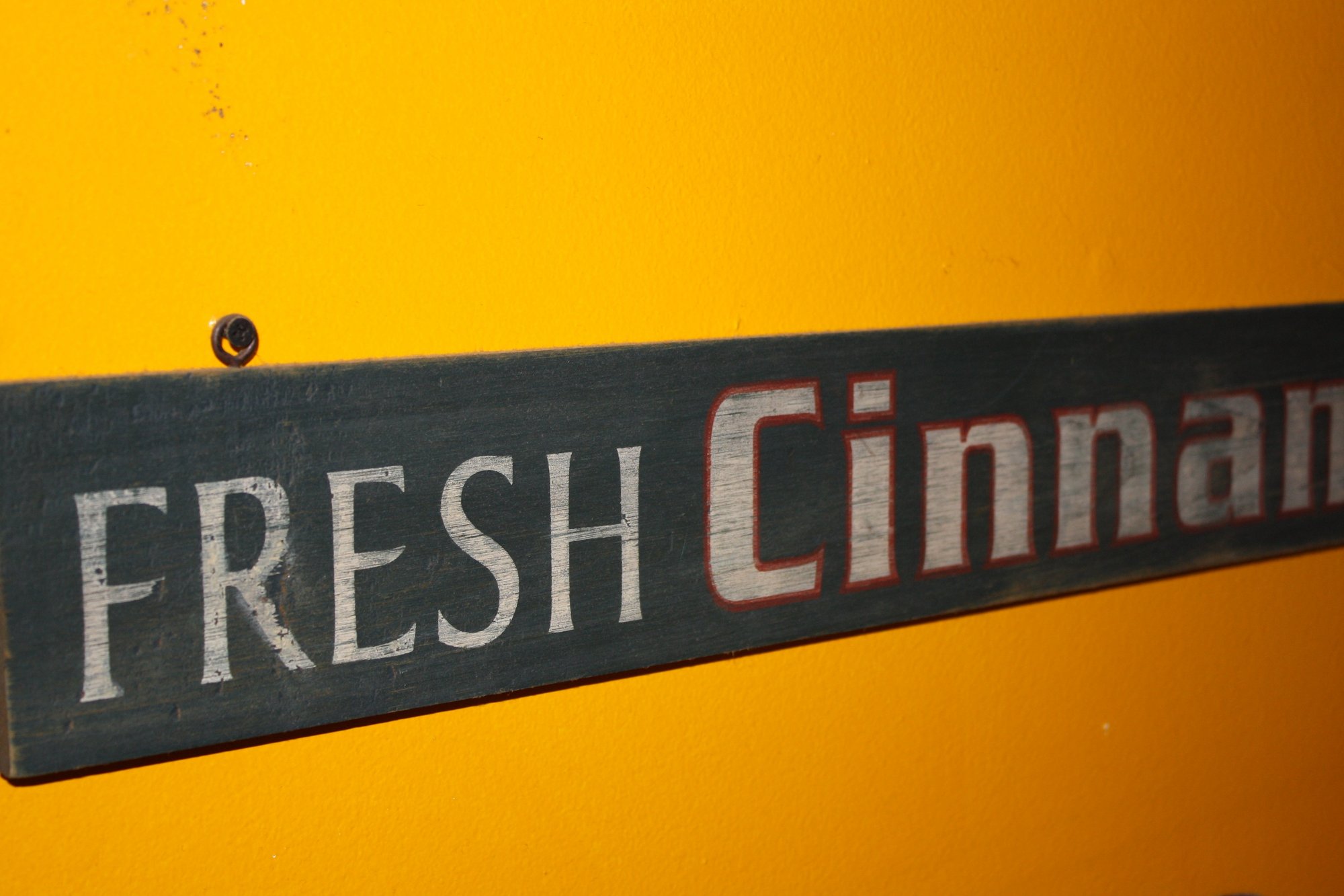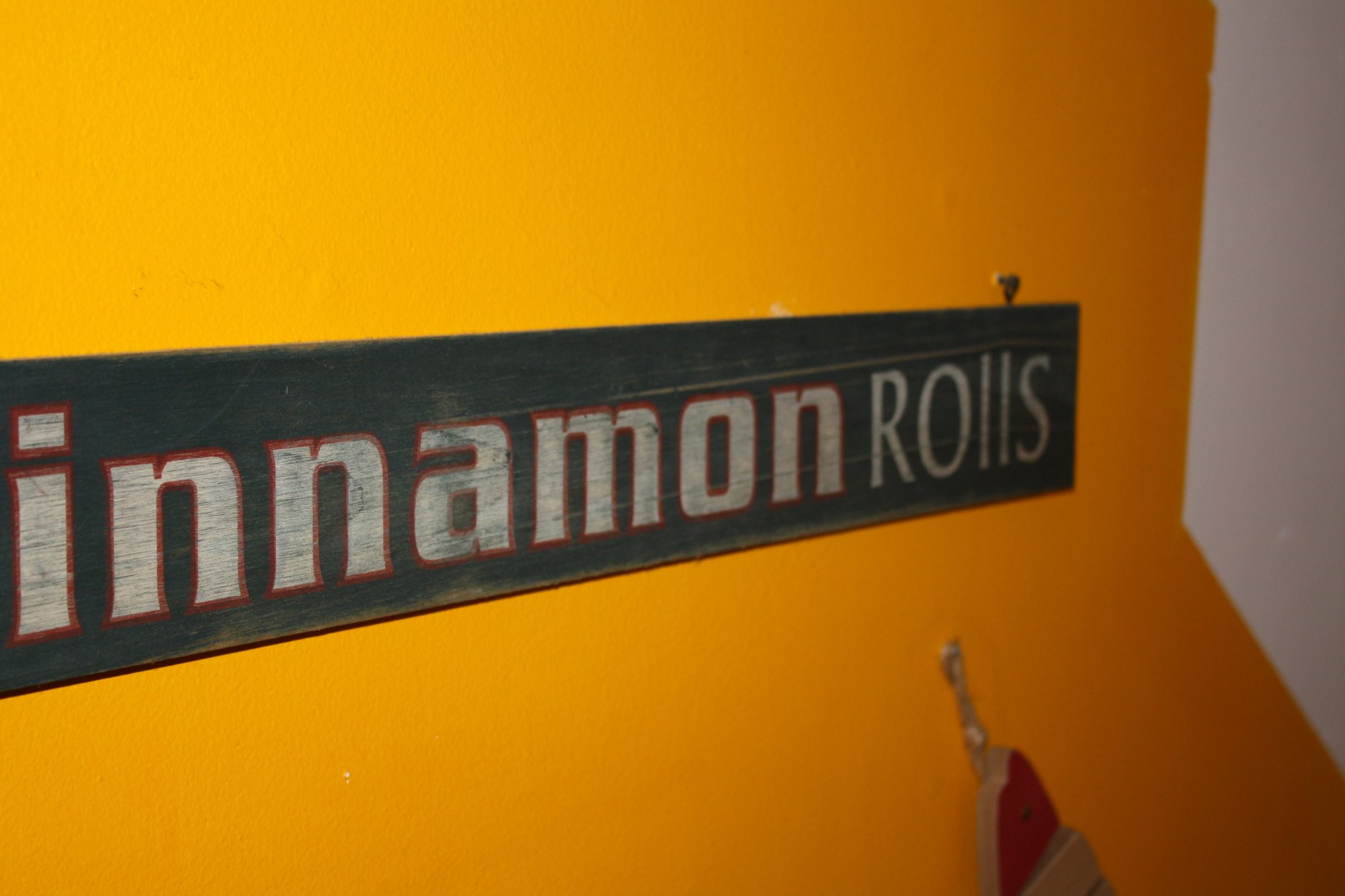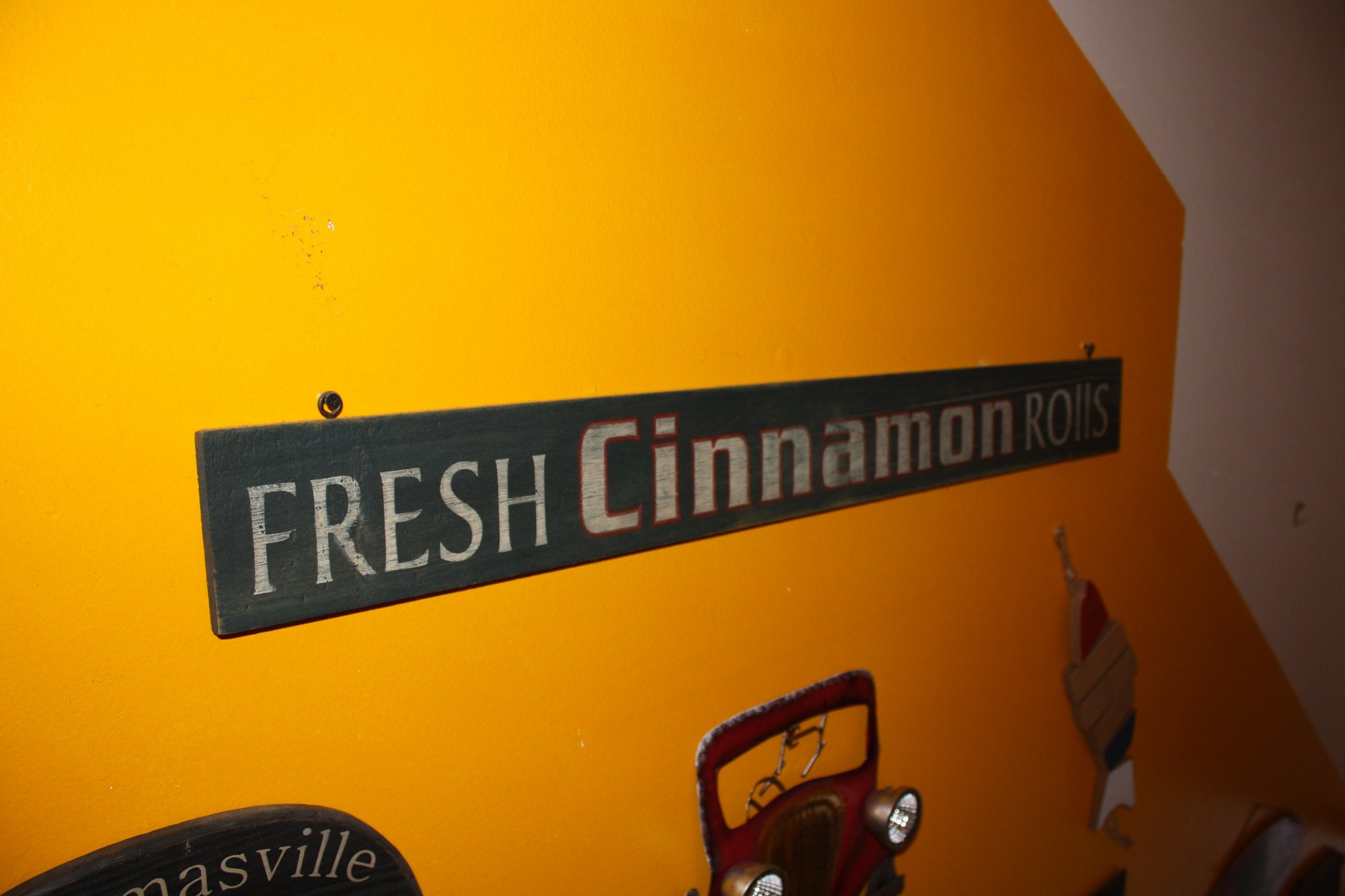 Decorative horizontal wooden sign featuring the text “FRESH Cinnamon ROLLS” in white and red lettering on a dark background. Designed to add a rustic, bakery-style charm to kitchens, cafes, or dining areas. Mounted on a wall, it serves as a cheerful and appetizing decorative accent.
