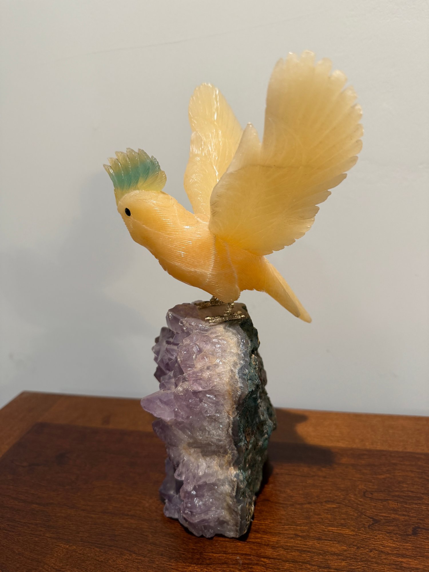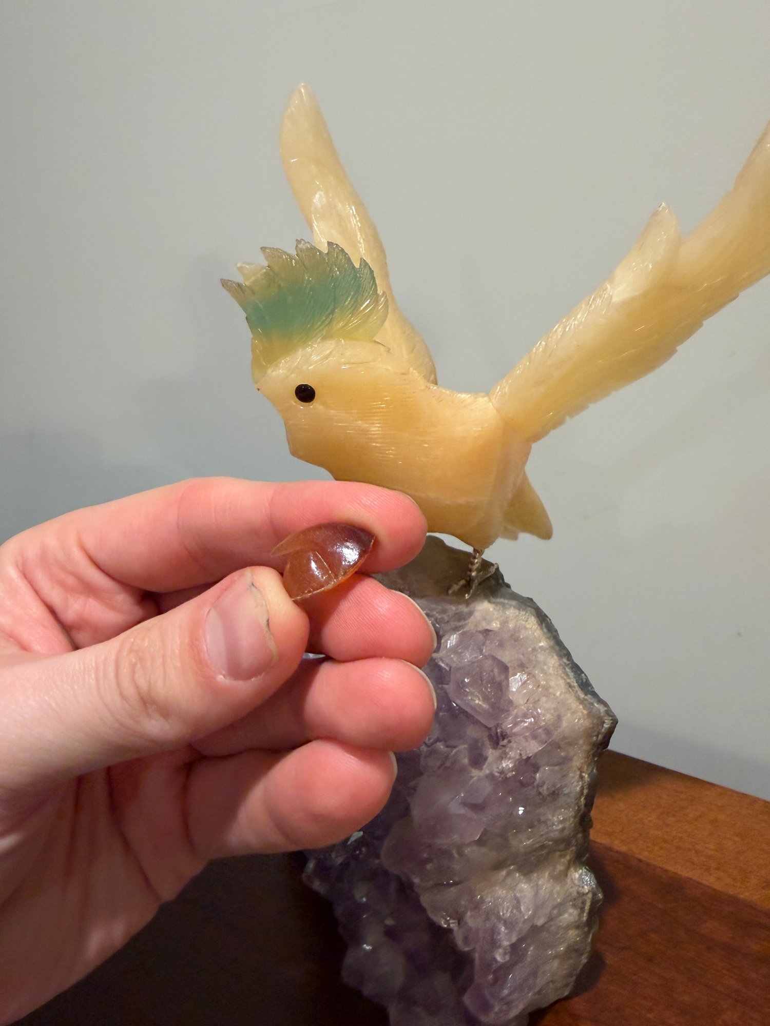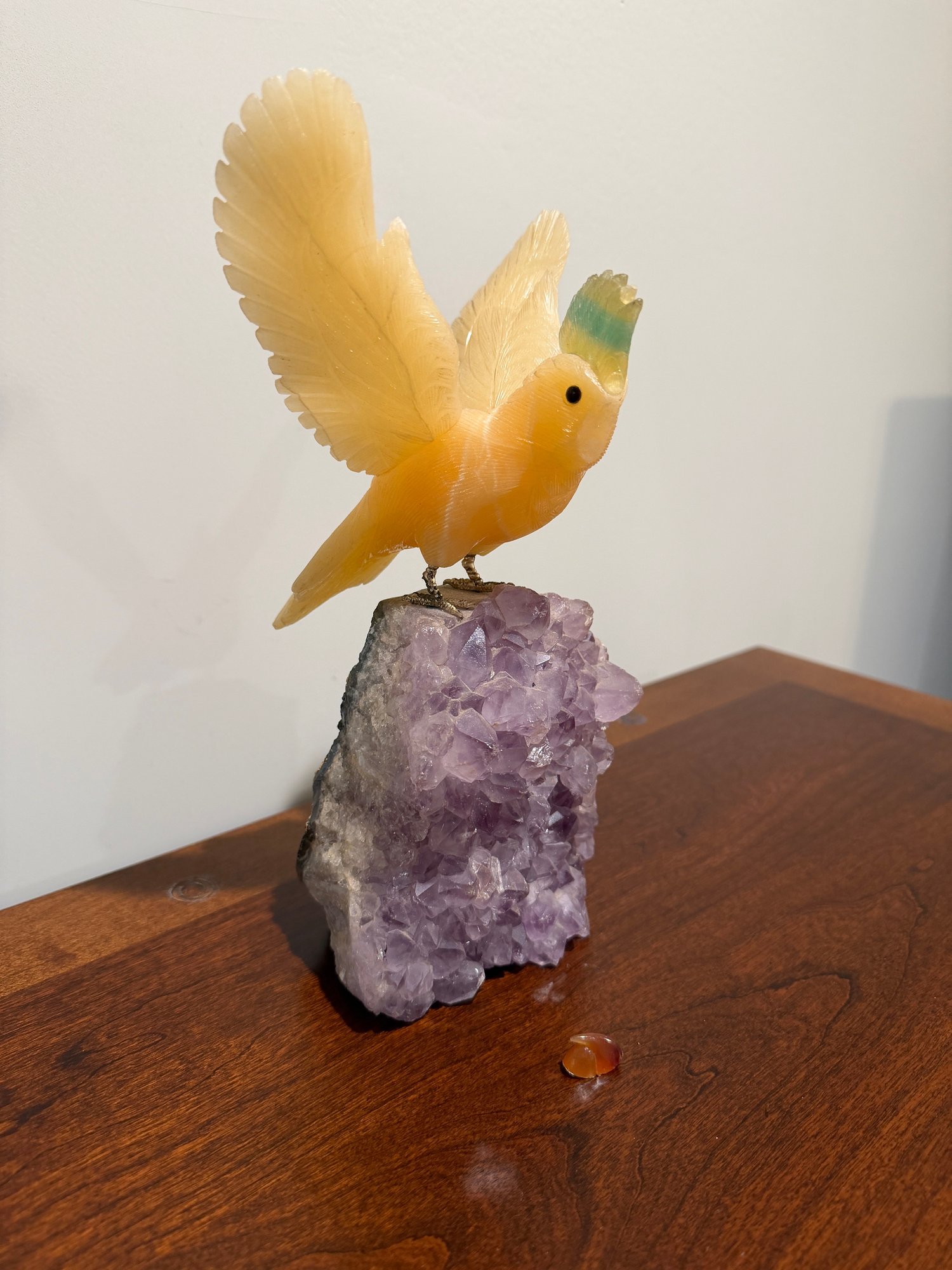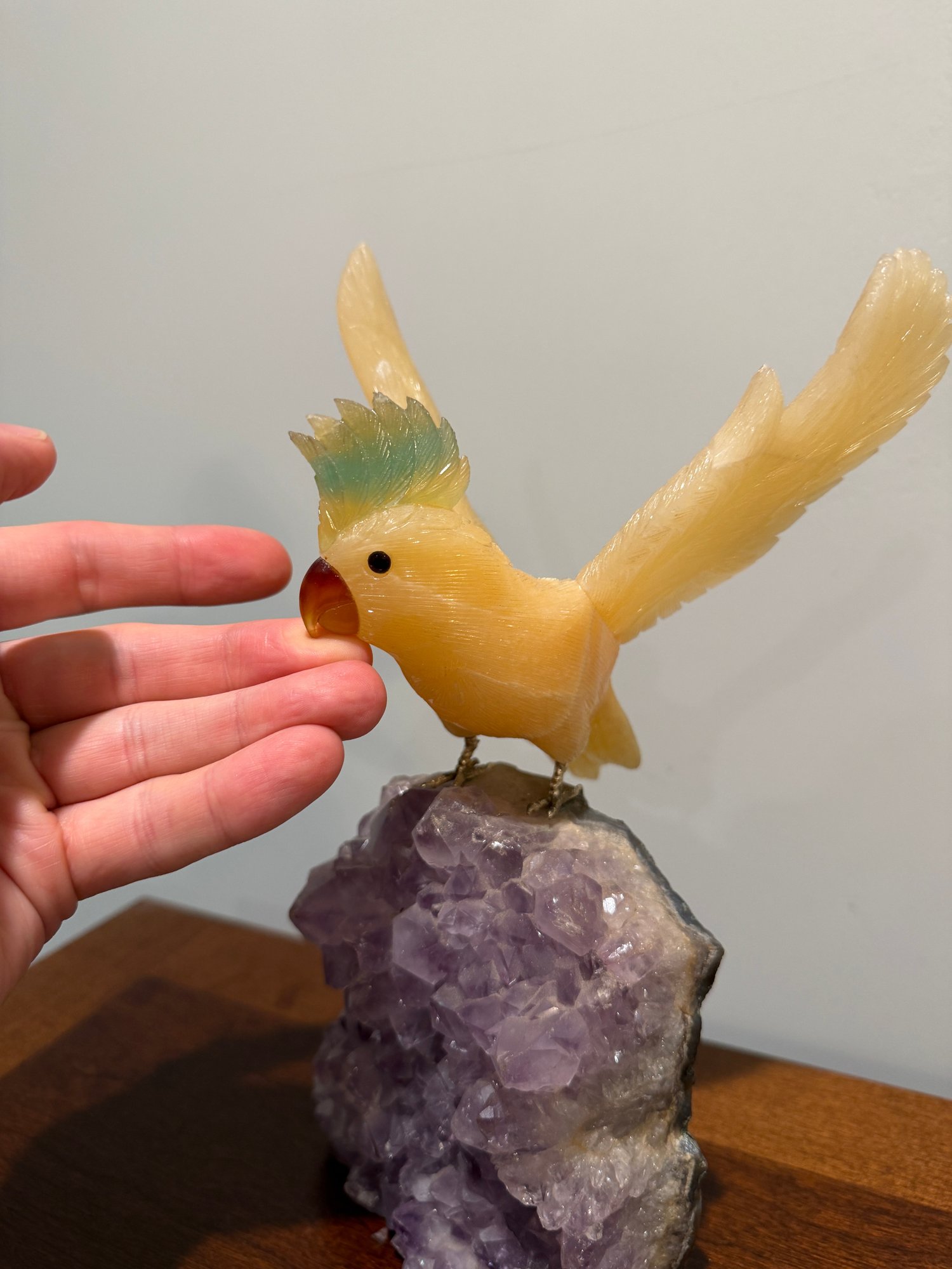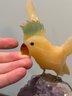 hand carved gem stone macaw parrot bird on amethyst and clear quartz nose needs to be glued