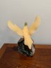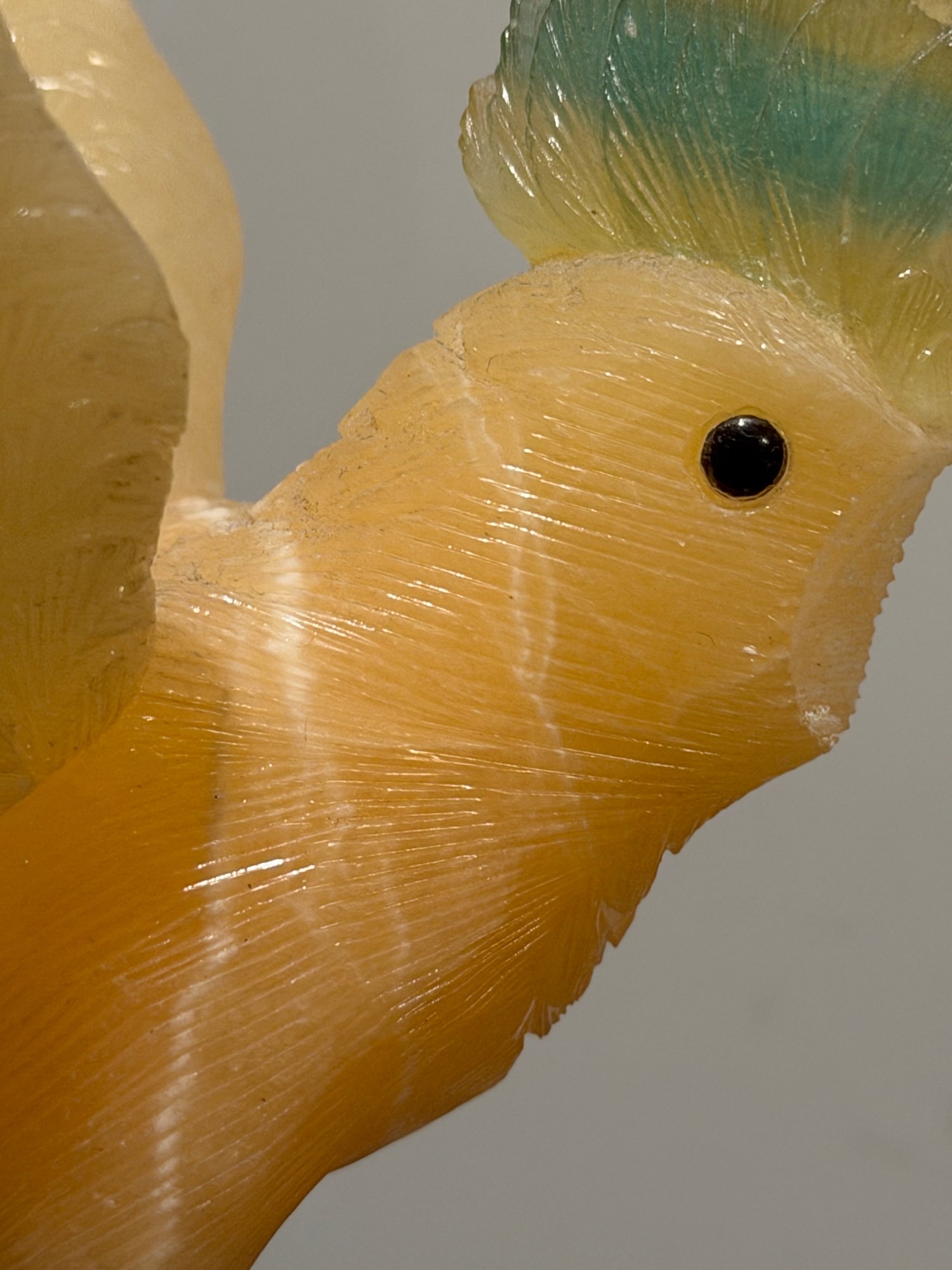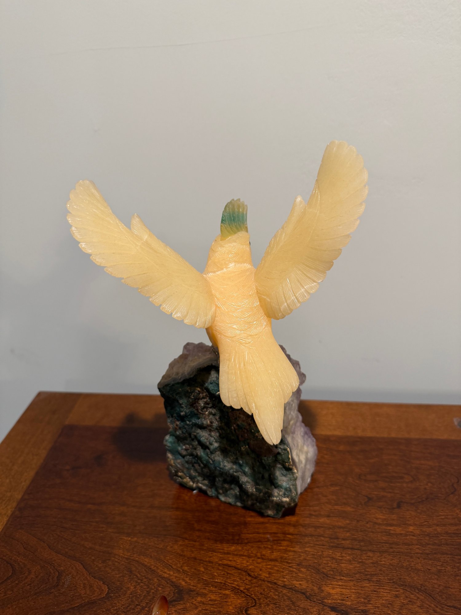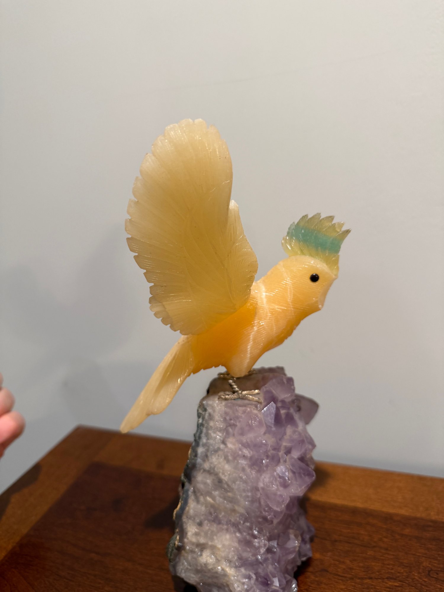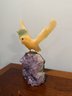 hand carved gem stone macaw parrot bird on amethyst and clear quartz nose needs to be glued