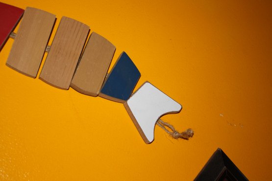 Decorative wooden fish wall hanging featuring a segmented, striped body painted in red, blue, and white. Hand-carved from wood with twine accents, it reflects a rustic nautical or Mediterranean style, ideal for coastal-themed home decor or accenting walls in living spaces.