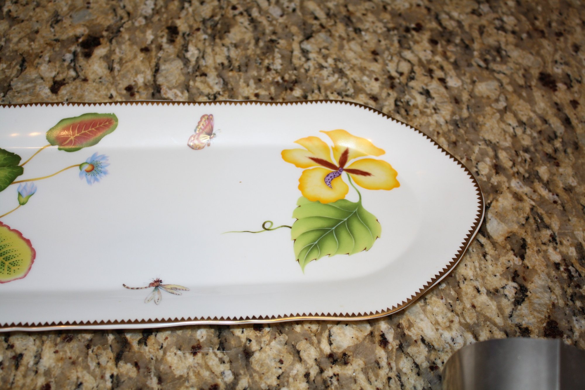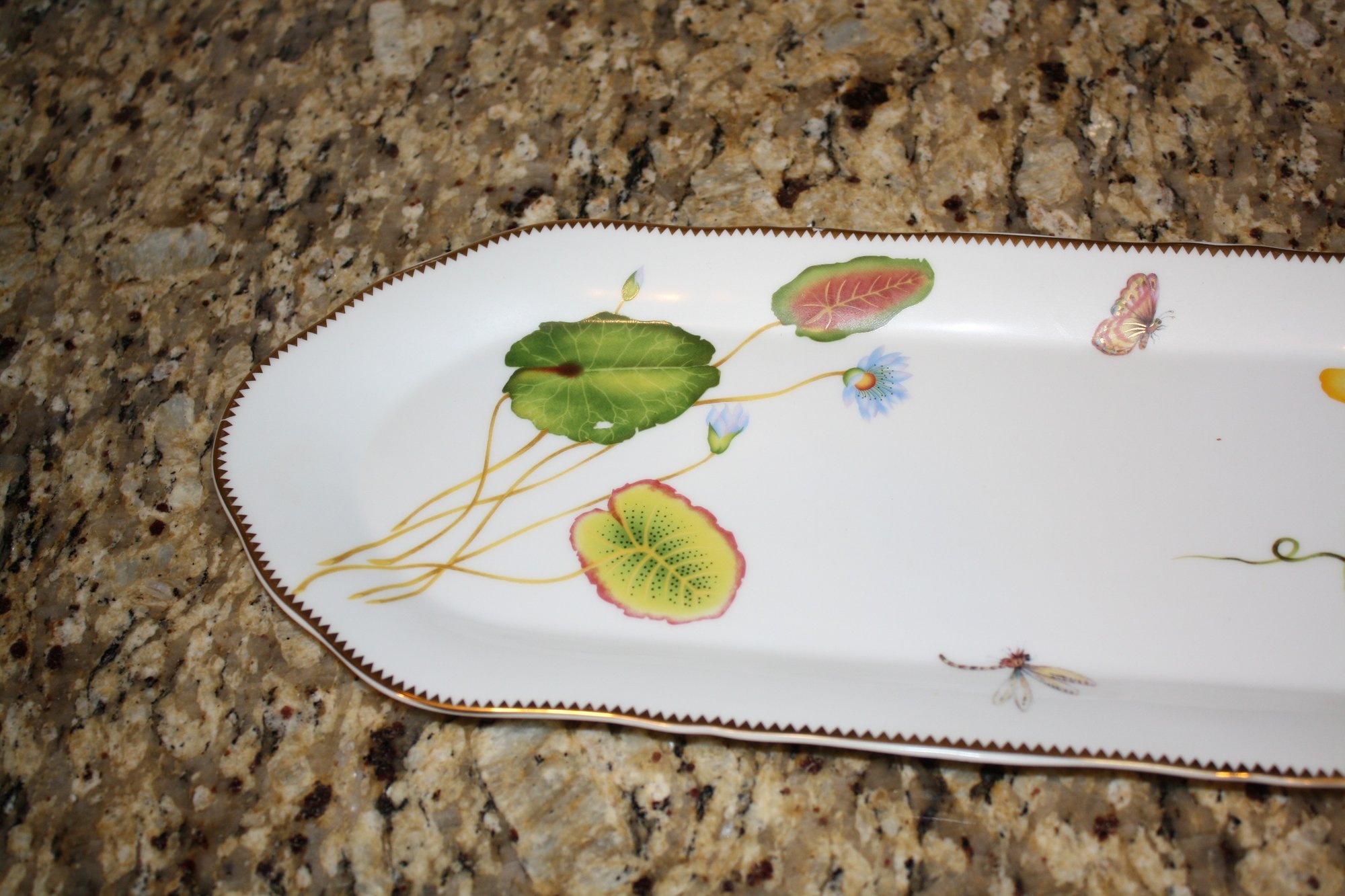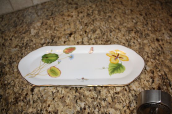 Porcelain serving platter featuring a hand-painted floral or seascape motif with delicate waterlily and botanical illustrations, accented with a gold-trimmed edge. The platter showcases intricate detailing and vibrant colors on a white ceramic base, suitable for display or serving.