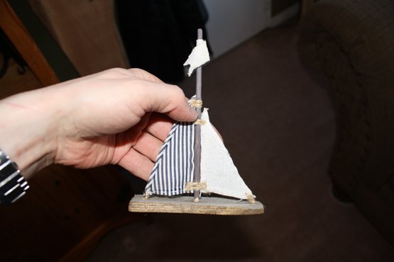Handcrafted sailboat decoration made from natural driftwood, designed for nautical or coastal-themed home décor. Ideal for display on shelves, tables, or mantelpieces, adding a rustic, seaside-inspired accent to any room. Lightweight and artisanal, perfect for beach-style interiors or casual tabletop displays.