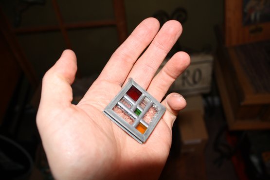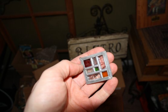 Handcrafted stained glass ornament featuring geometric colored glass sections in red, green, and orange, set in a lead or metal frame. Designed for use as a suncatcher, holiday ornament, or decorative pendant. Made from art glass cabochons and metal came, ideal for adding a colorful accent to windows or holiday décor.