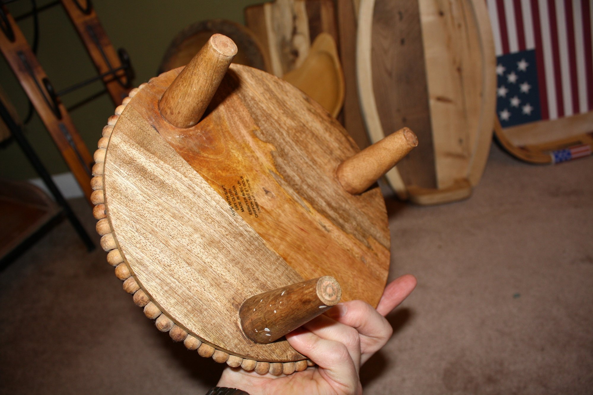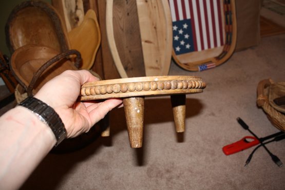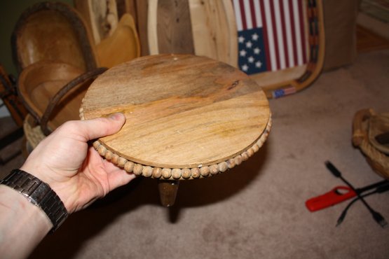 Decorative handcrafted wooden stool or display riser featuring a carved bead-trimmed edge. Made in India and finished with a natural wood tone suitable for use as a small stool, plant stand, or decorative display riser for home decor pieces. Solid wood construction with a flat top surface and traditional artisan craftsmanship. Marked “Made in India” with care instruction label advising to wipe with a soft dry cloth.