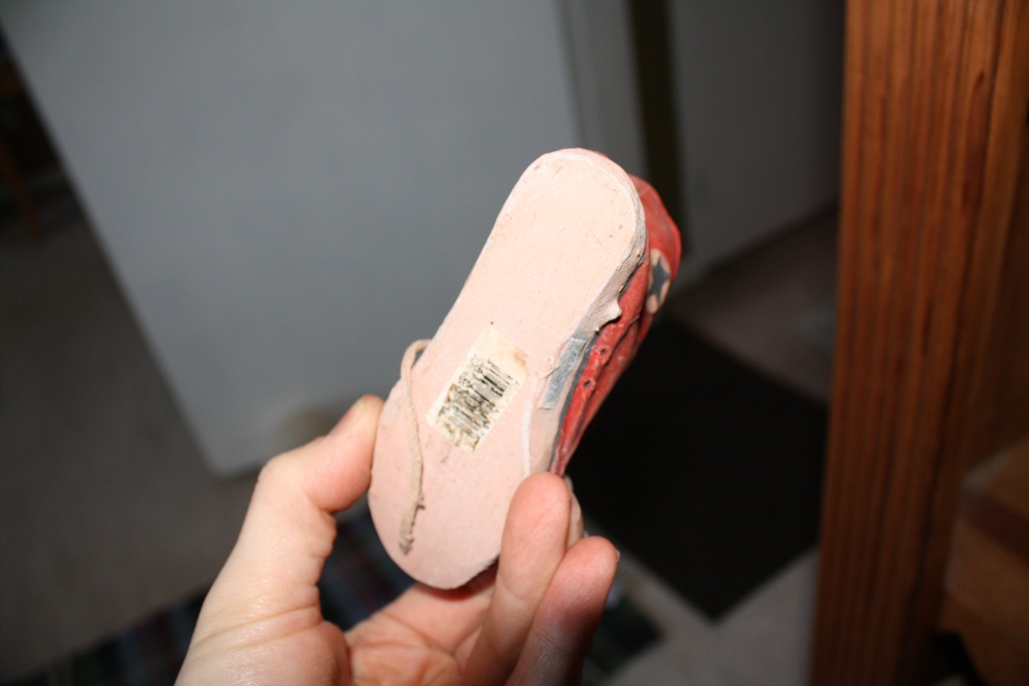 This small handcrafted figurine is shaped like a vintage high-top sneaker, featuring detailed laces and realistic canvas-style design. Made from a heavy material such as concrete or pottery, it serves as a decorative trinket or collectible, perfect for shelves, desks, or display cases.