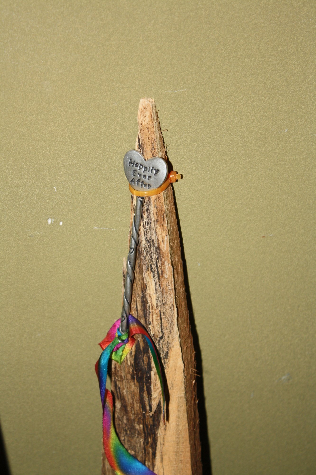 Handmade “Love” fairy wand measuring approximately 5 inches tall, featuring a metal heart motif with the phrase “Happily Ever After.” Designed with a spiraled metal handle and accented with approximately 6 inches of hand-dyed silk ribbon. Whimsical decorative piece ideal for romantic décor, fairy-themed displays, or collectible artisan accents.