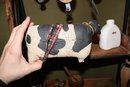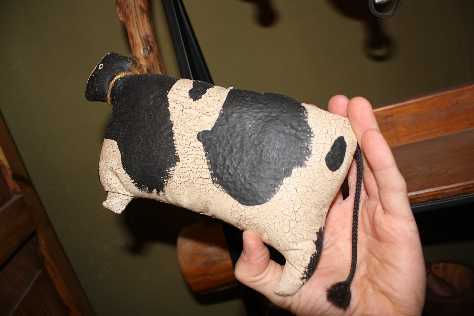 Handmade primitive folk art cow sculpture crafted from painted muslin or leather, featuring a rustic, weathered finish. Detailed paintwork simulates age, making it a charming country-style decorative piece. Collectible artisan décor, ideal for farmhouse, rustic, or vintage-inspired home settings.
