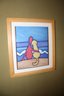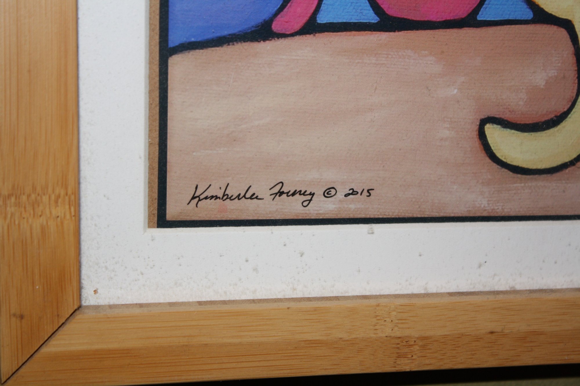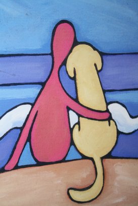 Framed art print titled "Heart and Soul" by Kimberlee Forney, featuring a minimalist, stylized depiction of a person hugging a dog while looking out over a body of water. The artwork is defined by bold black outlines and a vibrant color palette, characteristic of Forney’s signature acrylic style exploring themes of spirituality and the natural world. Suitable for home décor, office spaces, or as a gift for art and animal lovers.12" wide