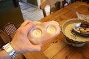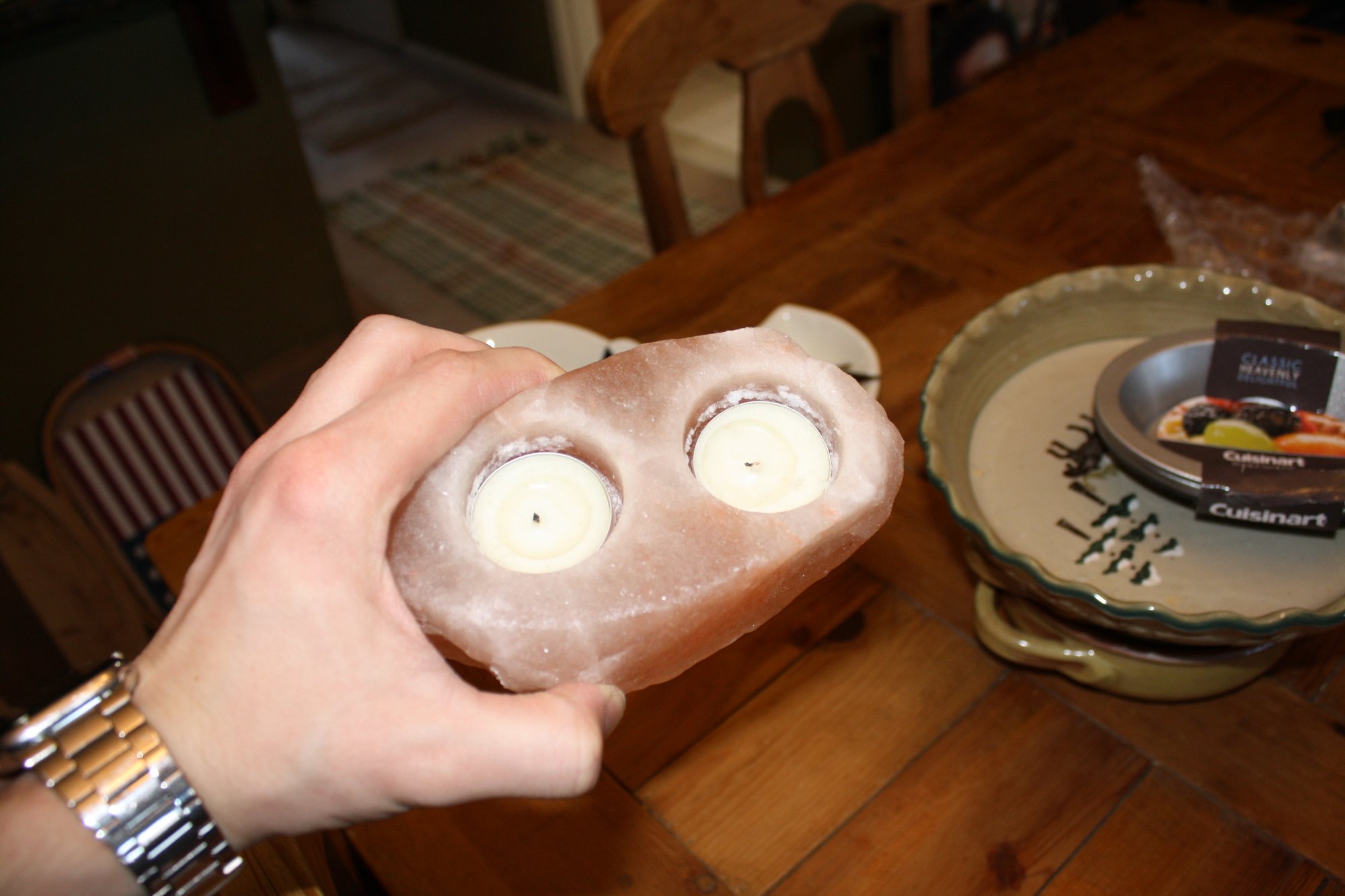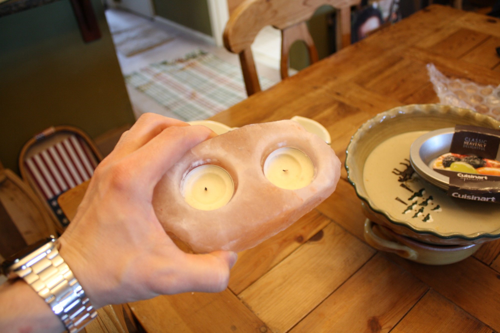Hand-carved Himalayan salt double tealight holder made from natural pink salt rock. Features two carved holes for standard tealight candles, emitting a warm, soft orange glow when lit. Each piece is unique in size, color, and shape, making it a charming and natural decorative accent for homes, meditation spaces, or cozy lighting displays.