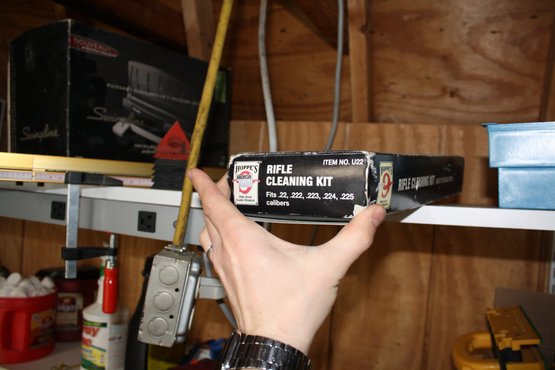 Hoppe’s No. 9 rifle cleaning kit designed for firearm maintenance and bore cleaning. Includes a 2 oz. bottle of Hoppe’s No. 9 solvent and lubricating oil, cleaning rod, caliber-specific bore brush, and cotton cleaning patches. Comes in a compact storage box for organized and convenient tool access. Suitable for routine rifle cleaning and maintenance.