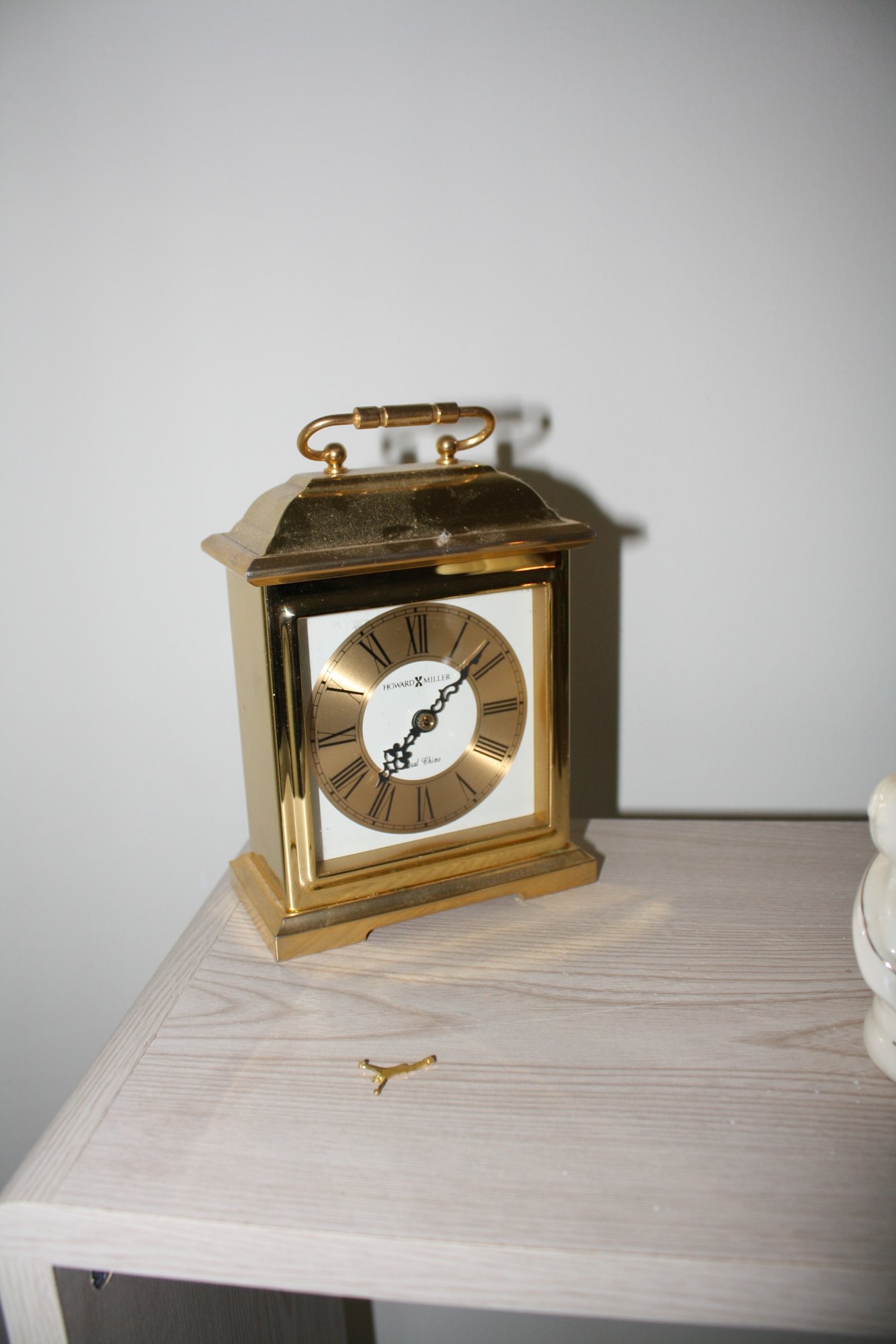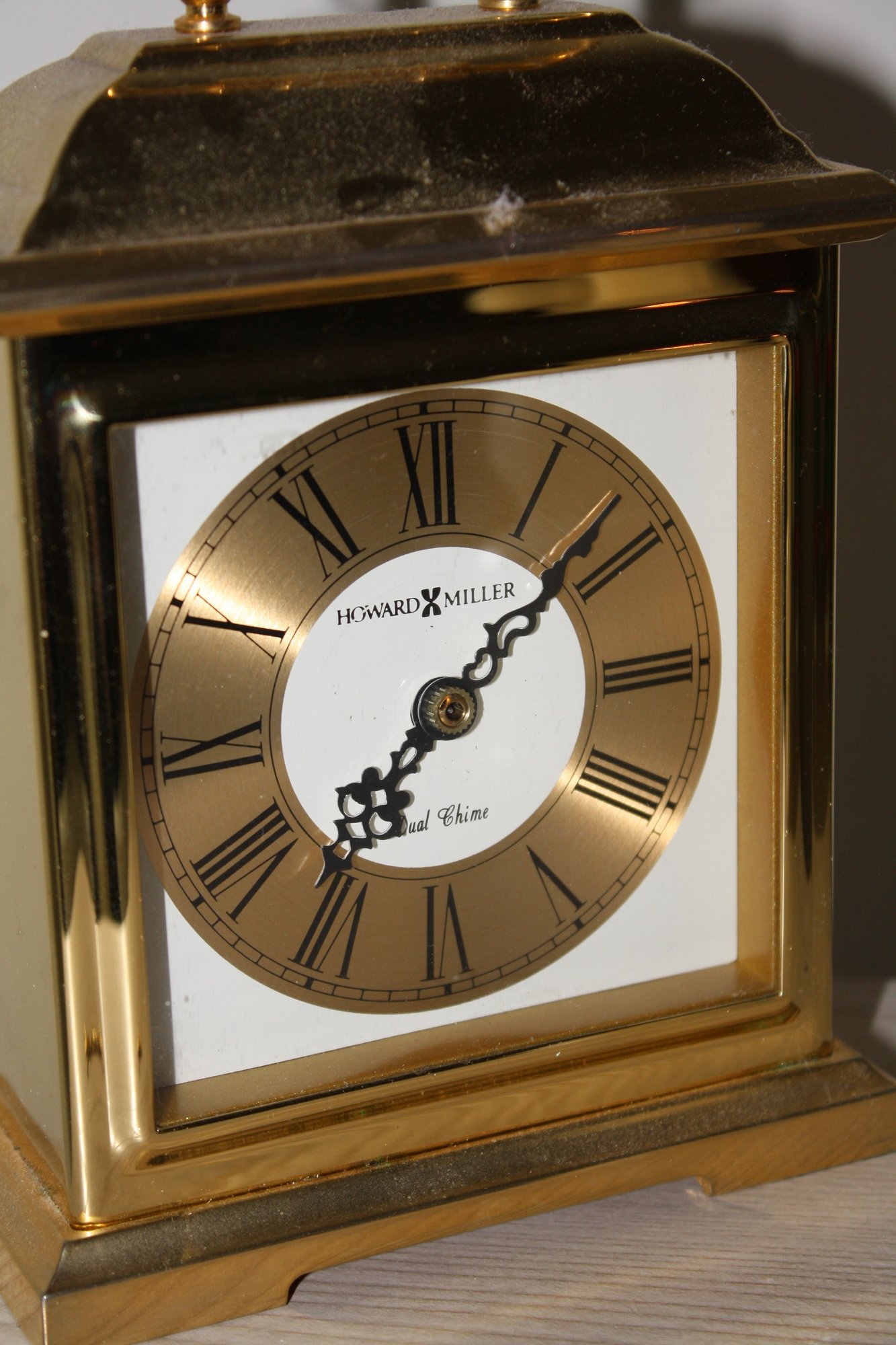 Howard Miller brass carriage clock featuring a polished brass case, traditional white dial with Roman numerals, and Westminster chime with dual chime functionality. Classic design suitable for mantel, desk, or collector display.