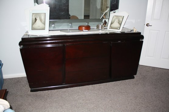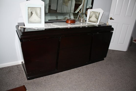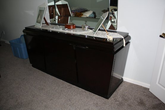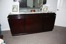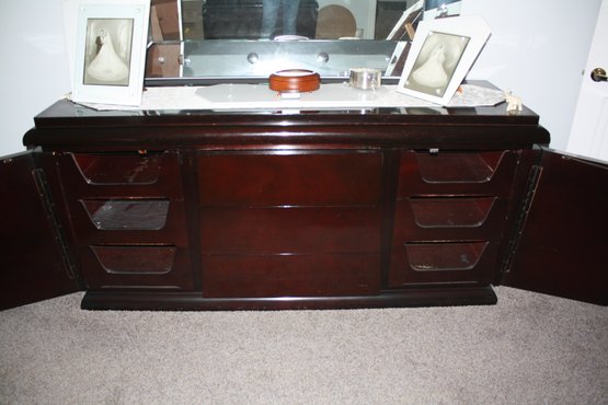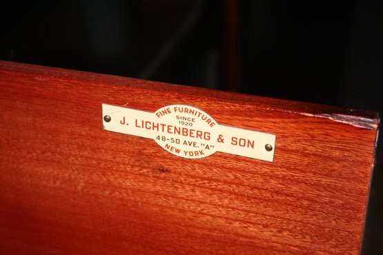 Vintage dark brown high-gloss sideboard by J. Lichtenberg & Son, Fine Furniture, New York (est. 1920). Measures approximately 75" wide, 23" deep, and 35" high. Features a post-modern design with solid wood construction and a metal maker’s tag, perfect for living rooms or dining areas as a stylish storage and display piece.
