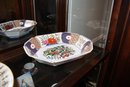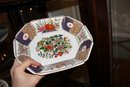 Japanese Imari style porcelain serving bowl featuring a distinctive octagonal form and richly detailed hand-painted decoration with traditional floral and brocade motifs, including peonies and chrysanthemums rendered in vibrant red, cobalt blue, and green tones with ornate gold trim accents. The interior and exterior display intricate patterned panels characteristic of Imari design, combining floral elements with stylized geometric borders and gilded highlights that create a visually striking composition typical of decorative Japanese porcelain artistry.