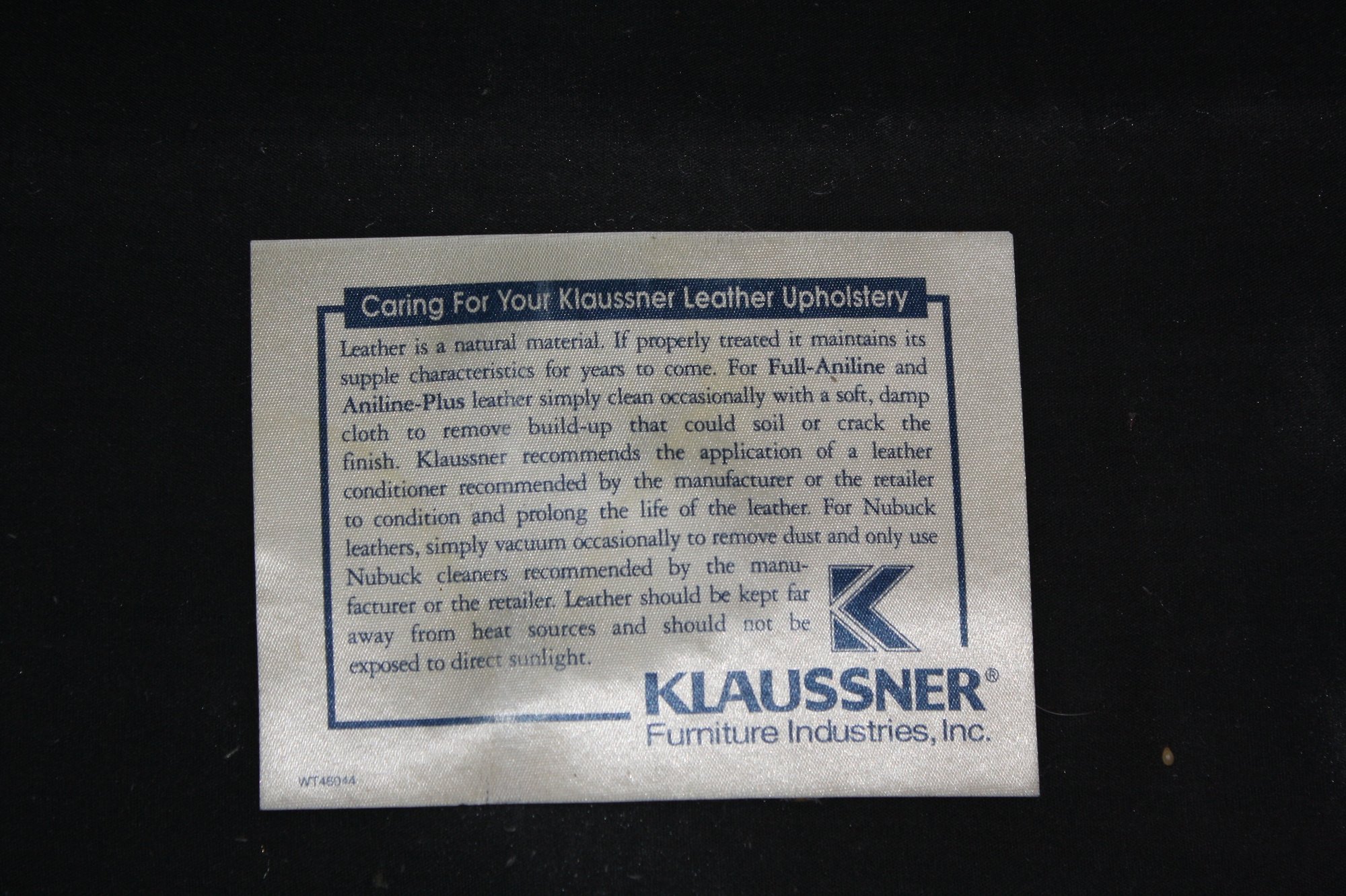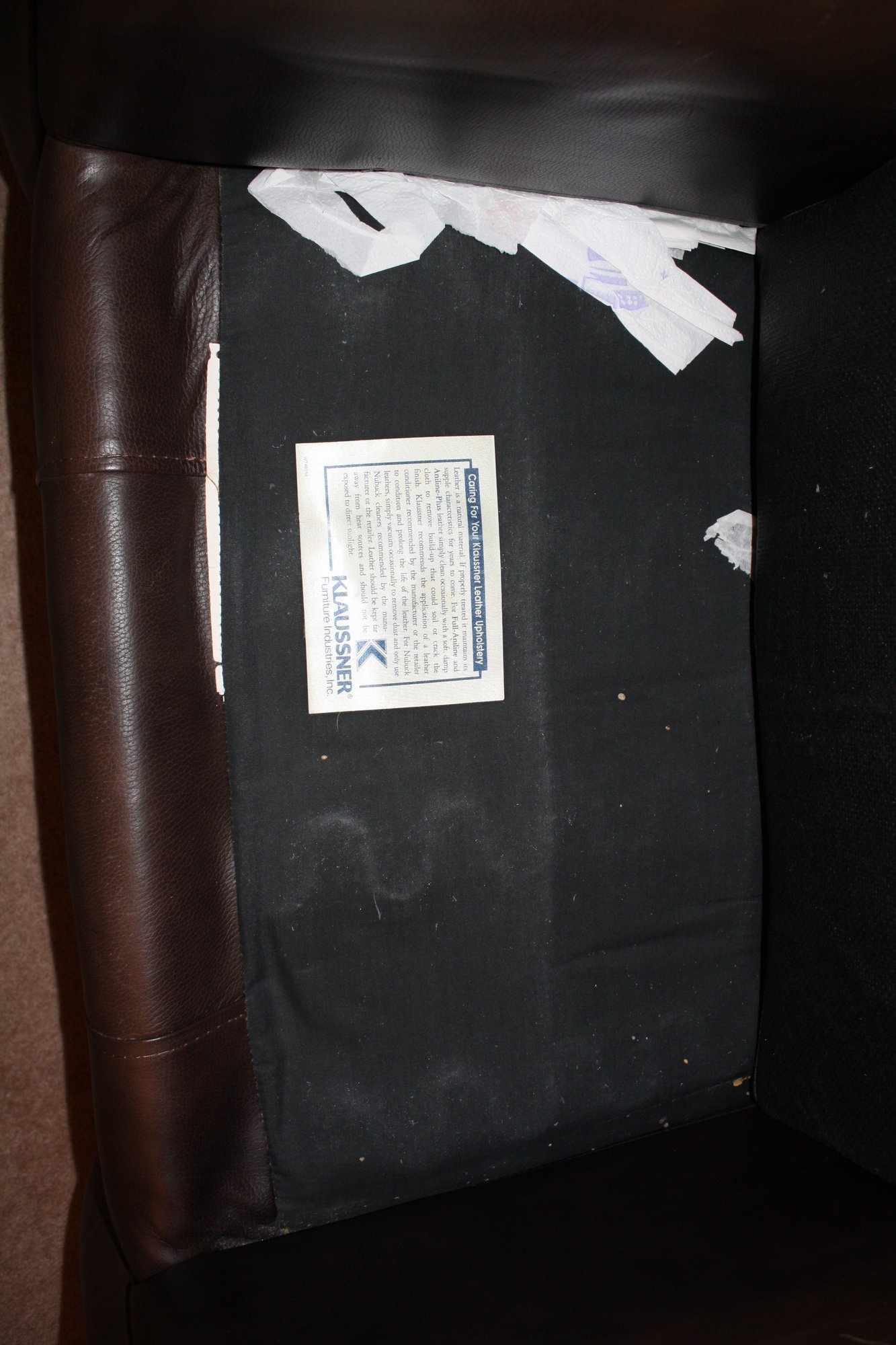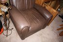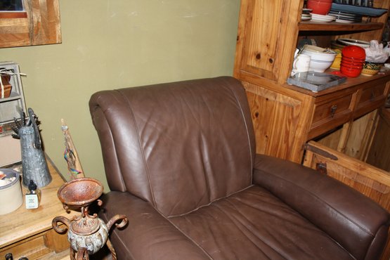Brown leather chair by Klaussner, measuring 39 inches wide, 41 inches long, and 38 inches high. Crafted from full-aniline or Aniline-Plus leather with a soft, comfortable finish. Designed for relaxation with reclining functionality, suitable for living rooms or home theaters. Includes care instructions: clean with a soft damp cloth, condition with manufacturer-recommended products, vacuum Nubuck leathers, and avoid direct sunlight or heat sources.