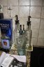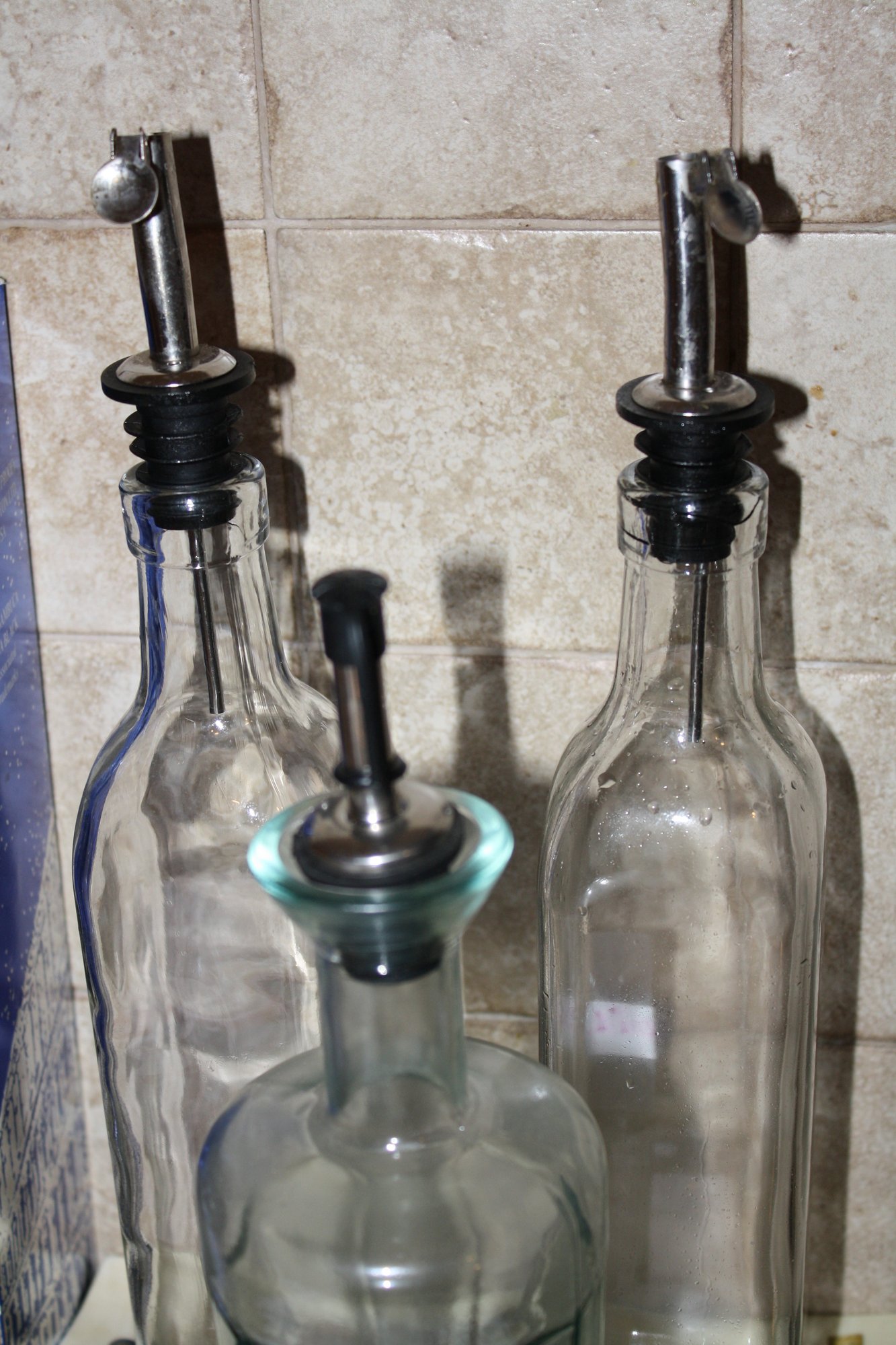 Set of clear glass bottles with stainless steel pour spouts designed for precise dispensing of oil, vinegar, or other liquid condiments, featuring a secure lid and ergonomic shape for controlled pouring and storage.
