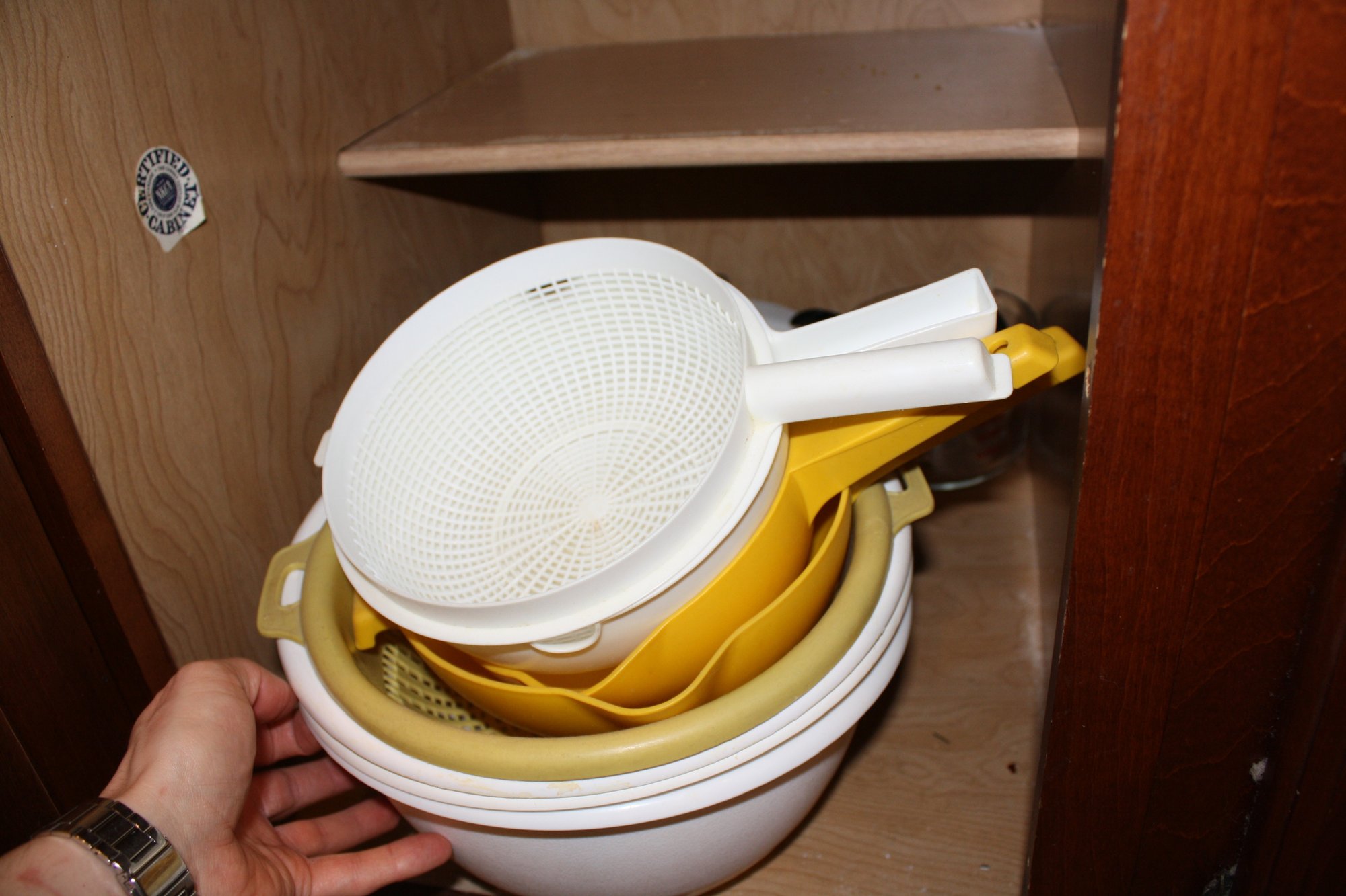 Stackable plastic kitchen colanders and bowls made of durable, lightweight material with perforated designs for draining liquids and smooth interiors for mixing, storage, and food preparation.