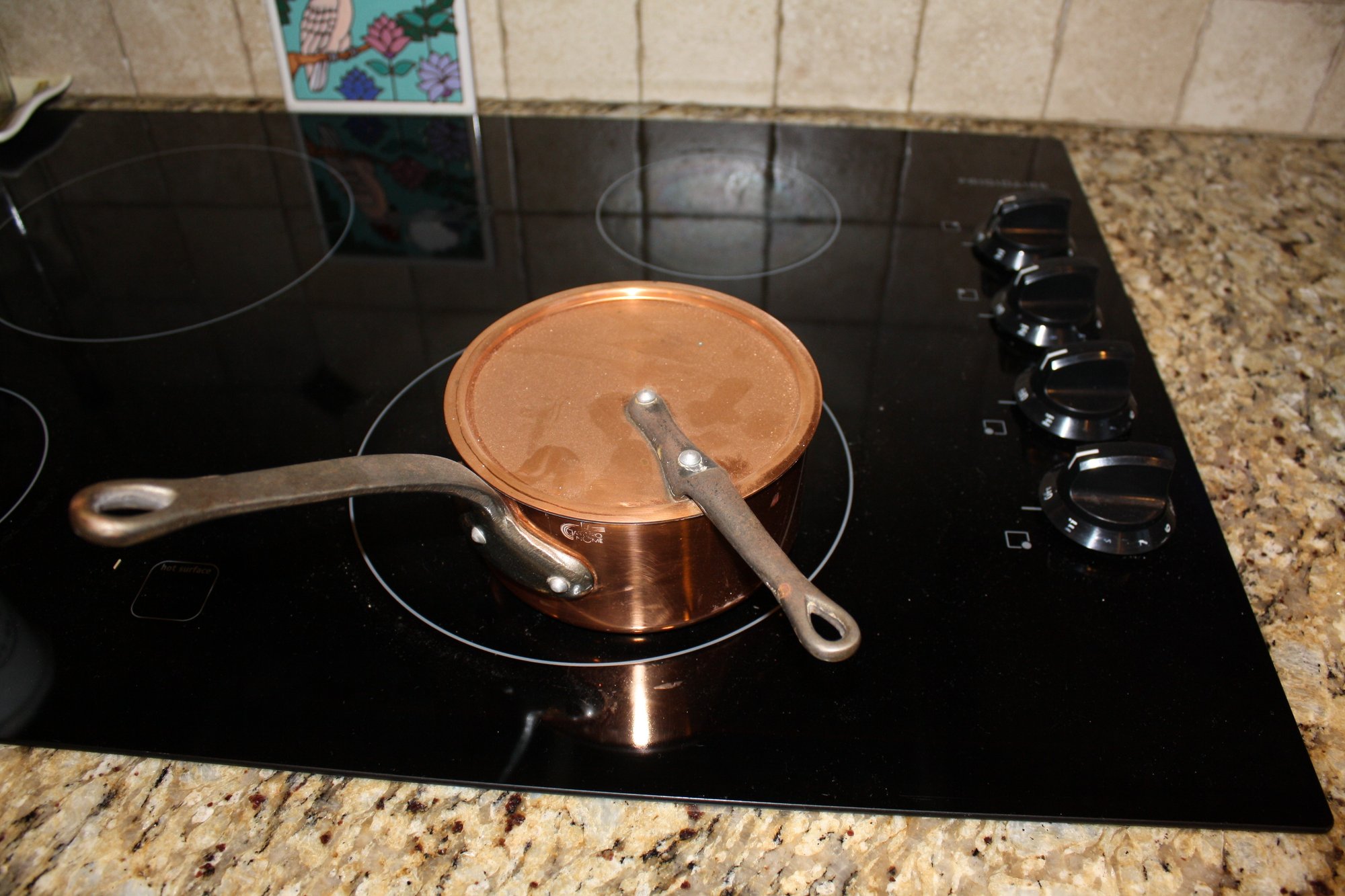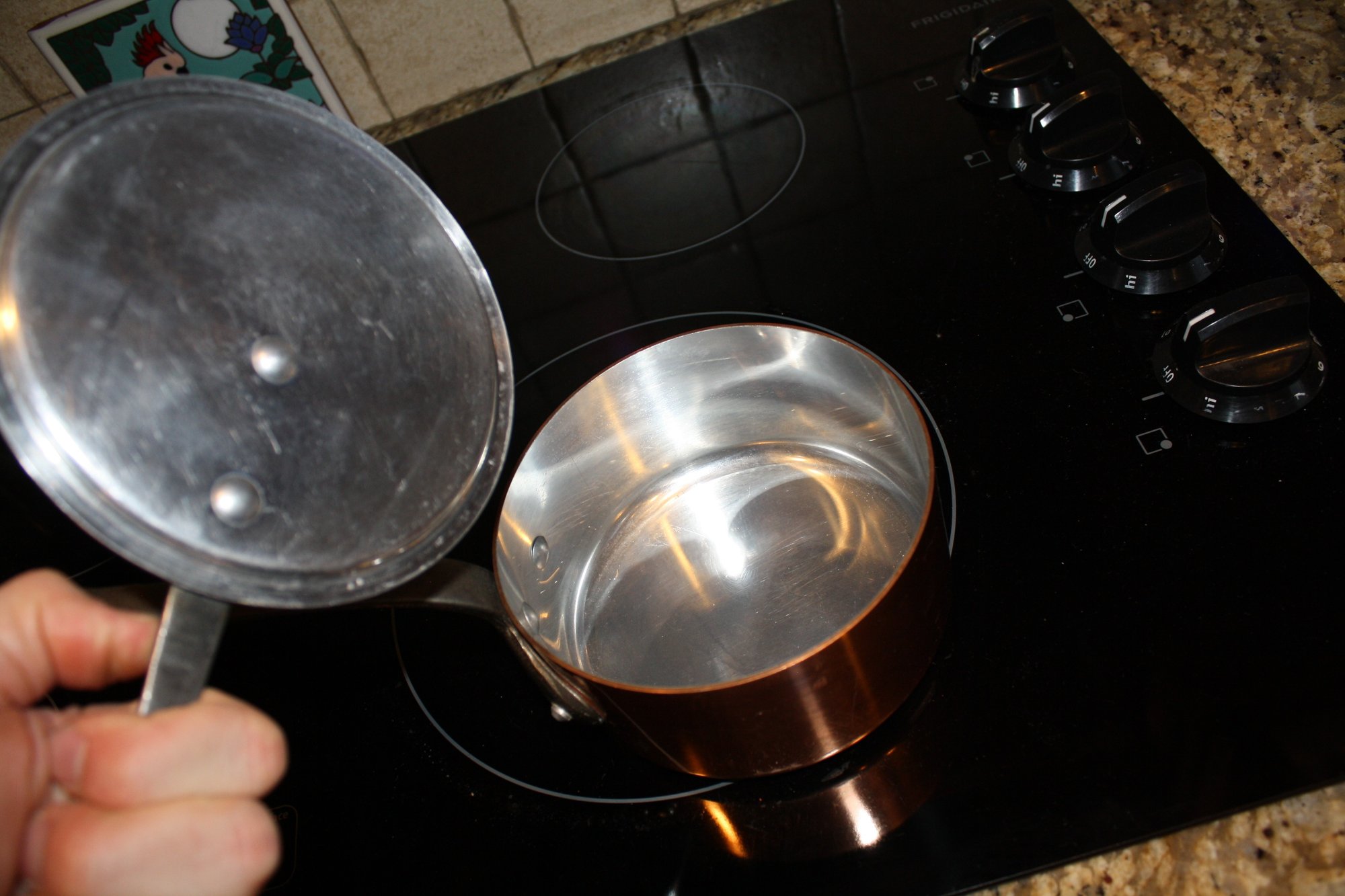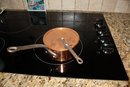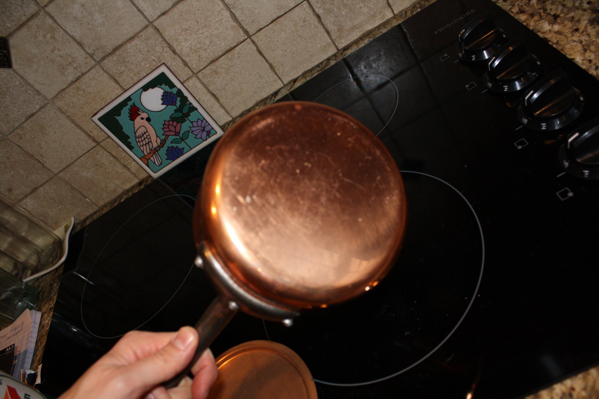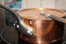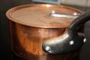 Copper saucepan featuring a riveted metal handle and matching lid, constructed for excellent heat conductivity, with an interior lining often made of tin or stainless steel and designed for cooking or decorative display, requiring polishing to maintain its shine.