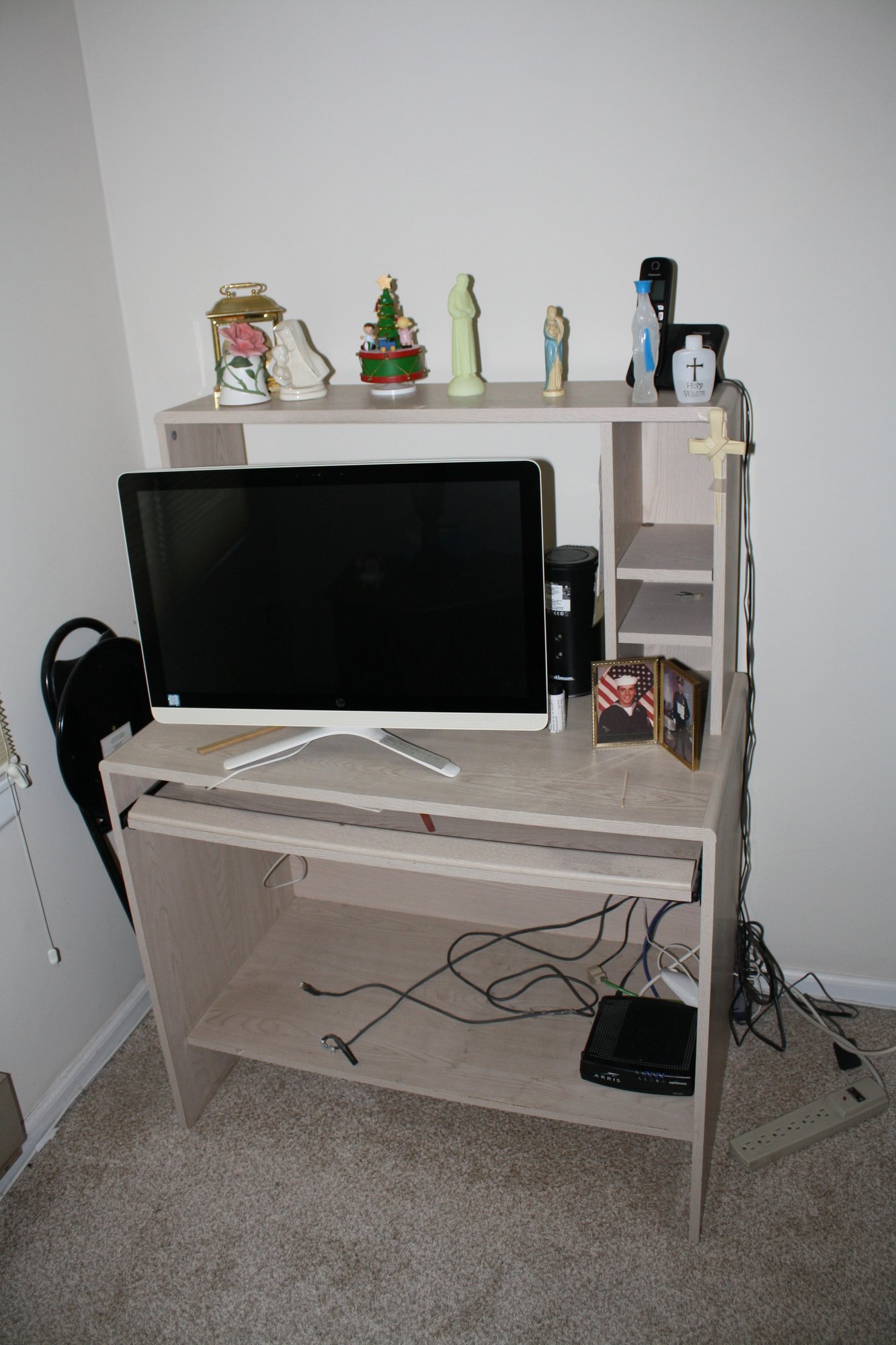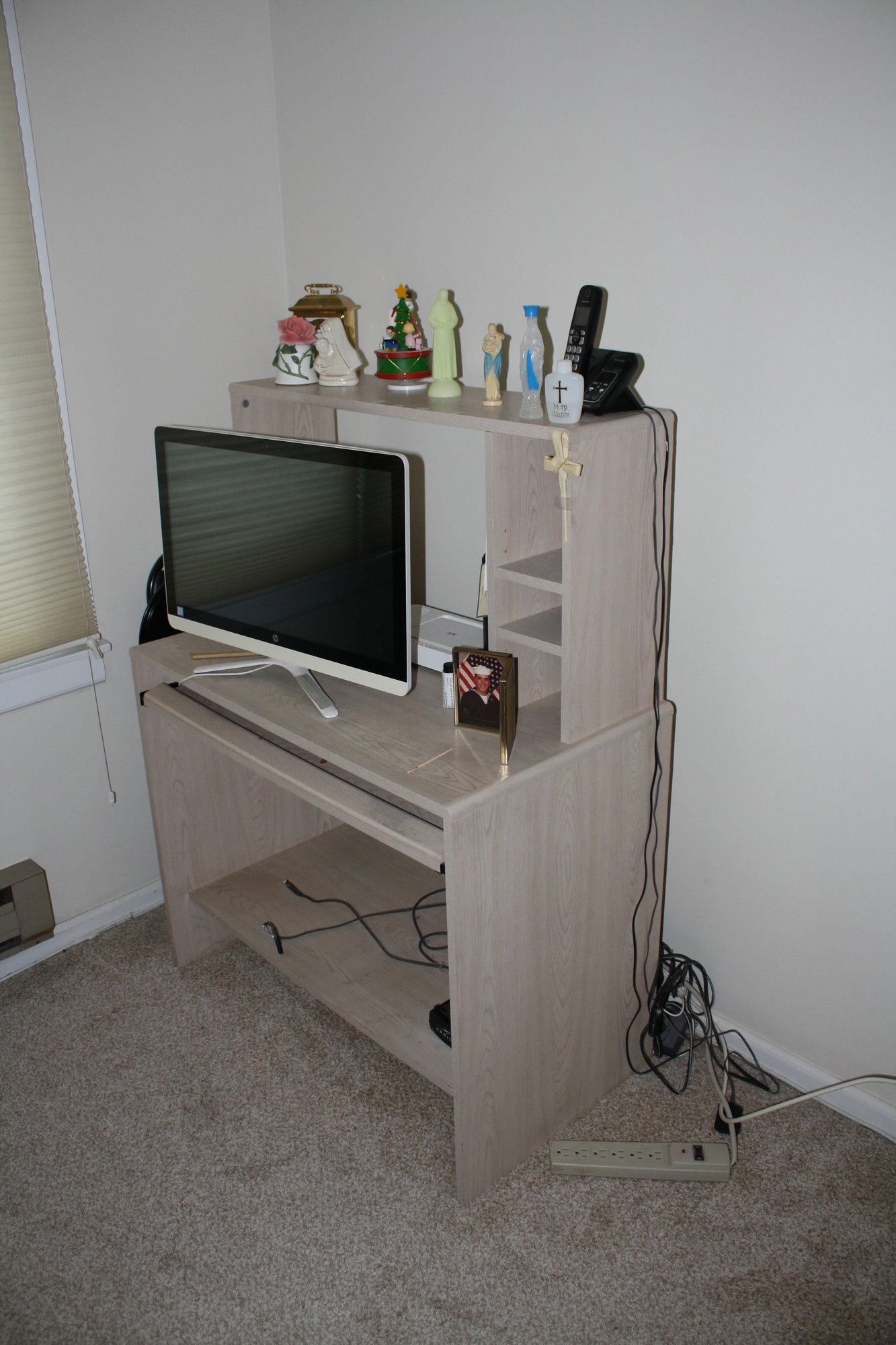 Light-colored wooden computer desk measuring approximately 36" wide, 21" deep, and 48" high. Features an integrated storage hutch and a sliding keyboard tray for functional workspace organization. Ideal for home offices, bedrooms, or study areas.