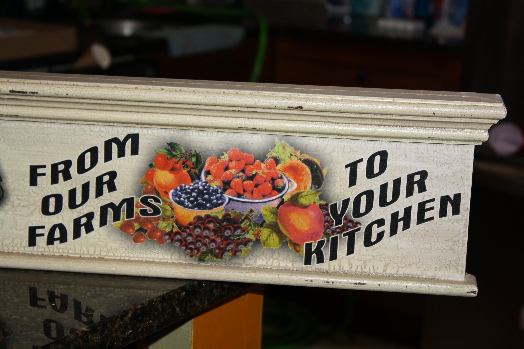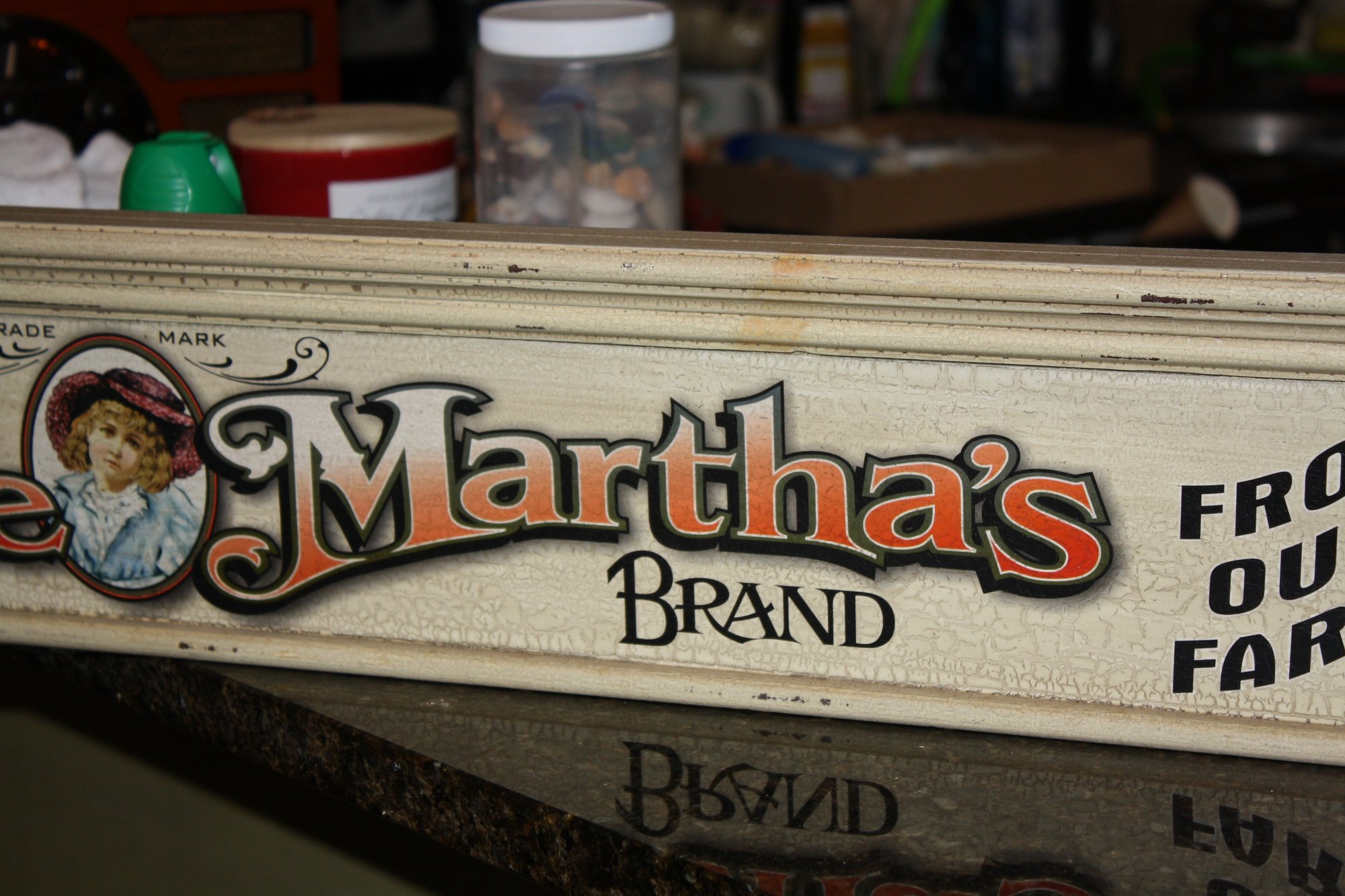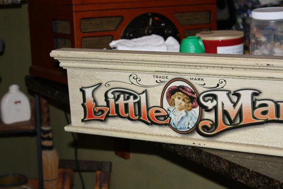 Vintage-style decorative sign featuring “Little Martha’s Brand” with the tagline “From Our Farms to Your Kitchen.” The design includes an illustration of a young girl alongside a colorful assortment of fruits, giving it a classic farm market aesthetic. Printed with bright vintage-inspired graphics, suitable for farmhouse kitchen décor, pantry display, or wall hanging.
