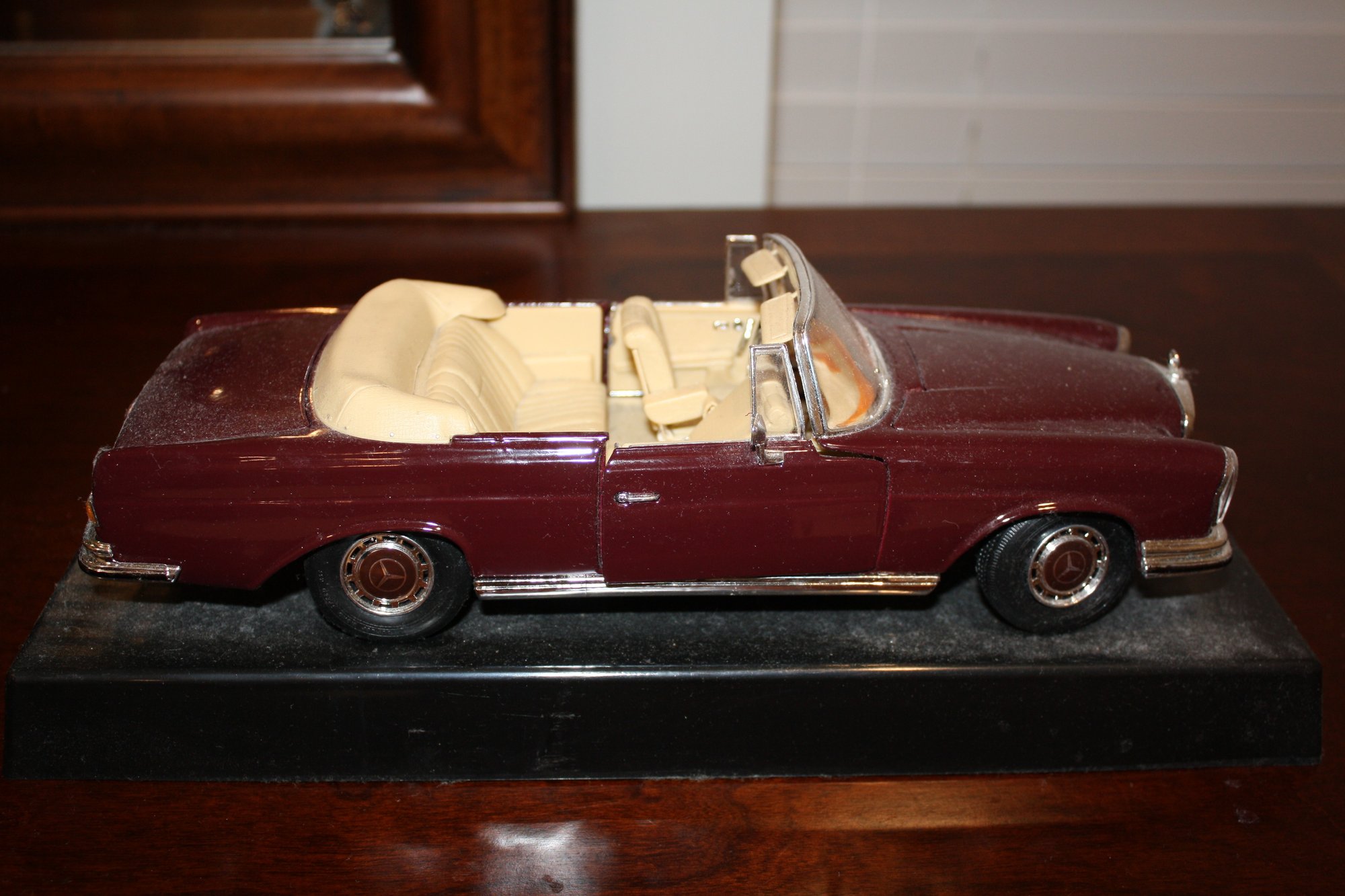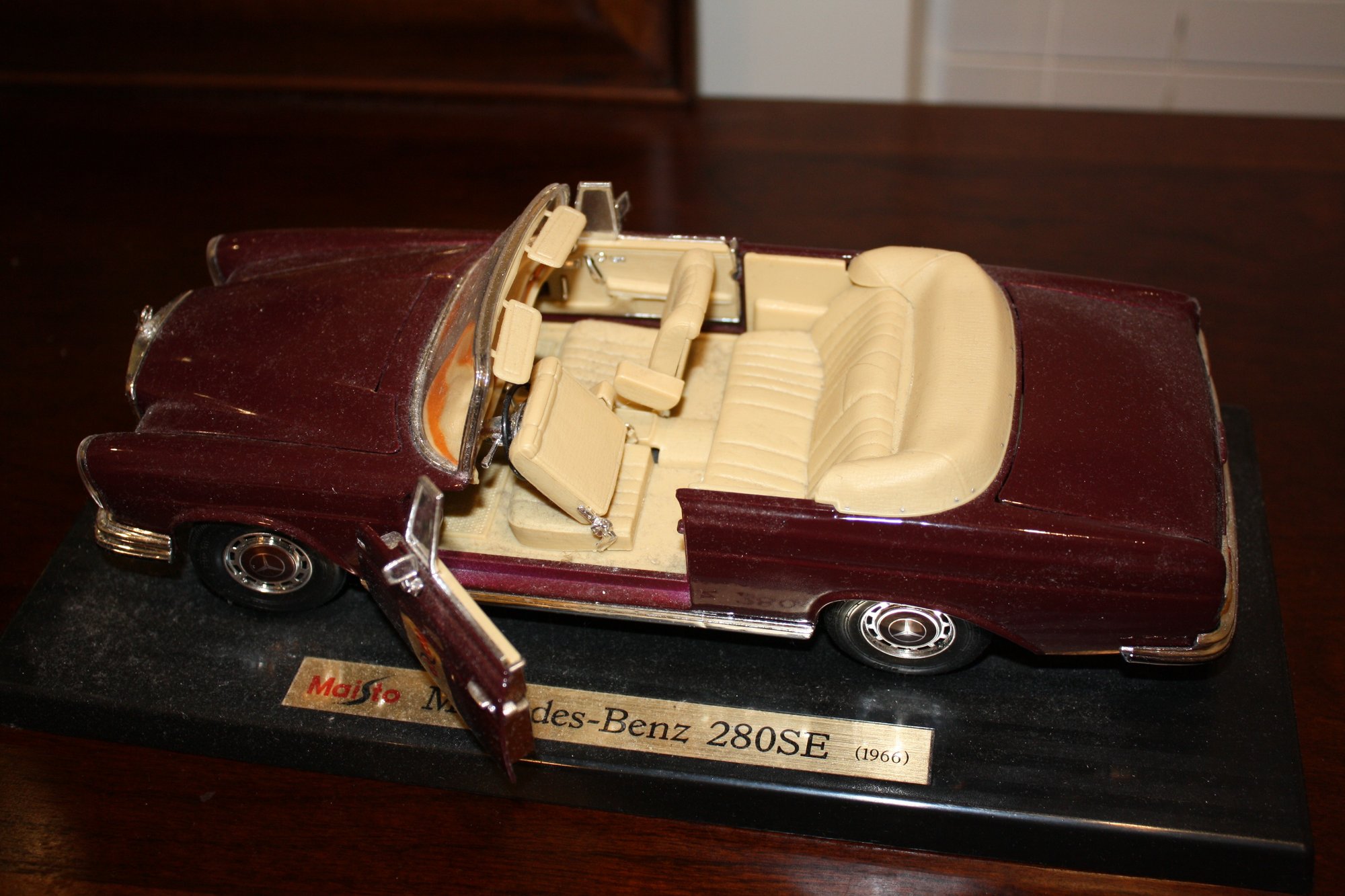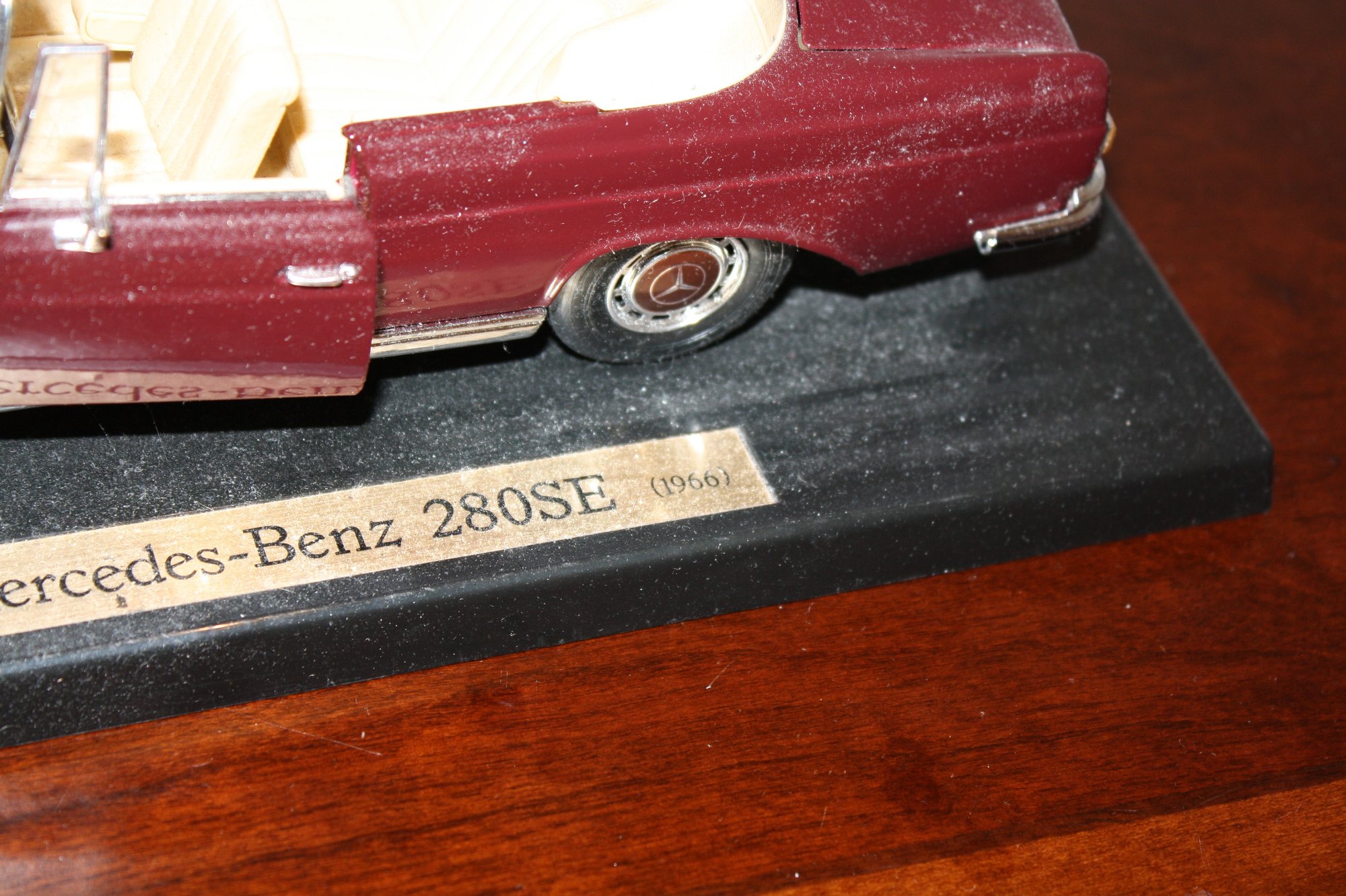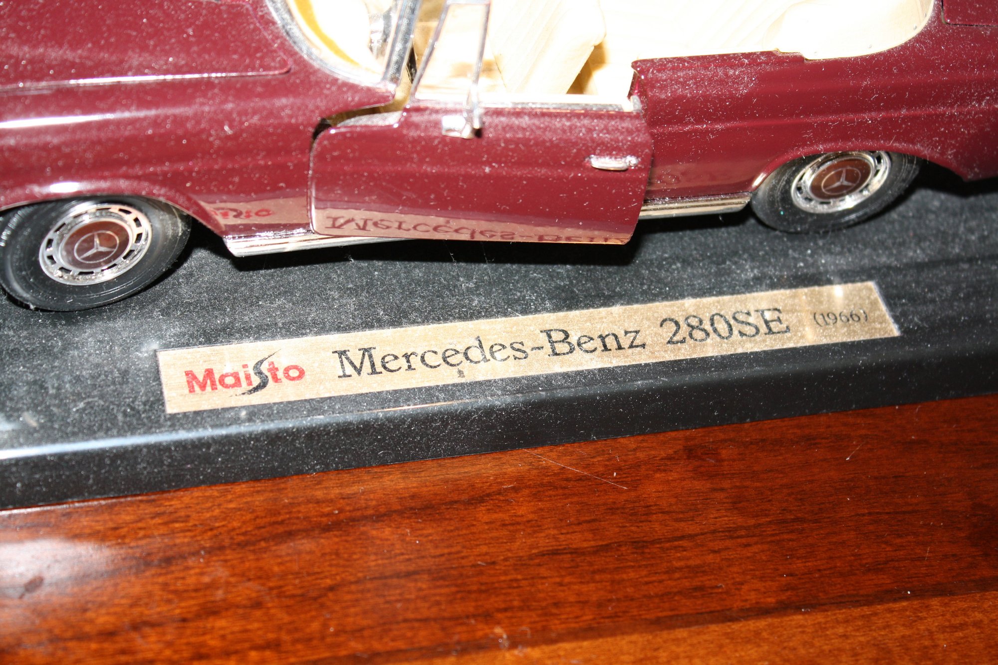 Maisto 1:18 scale die-cast model of a 1966 Mercedes-Benz 280SE convertible featuring a maroon exterior paired with a beige interior, detailed body styling with chrome-tone accents, realistic wheels, and finely crafted trim elements, presented on a display stand with model nameplate highlighting the classic luxury convertible design and collectible automotive replica craftsmanship.