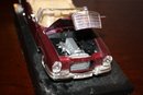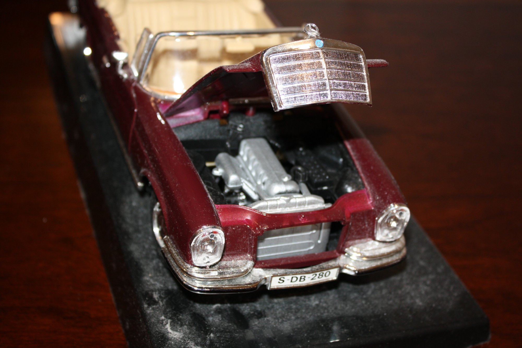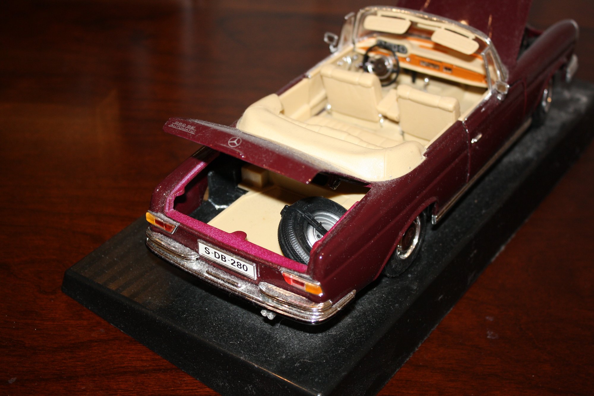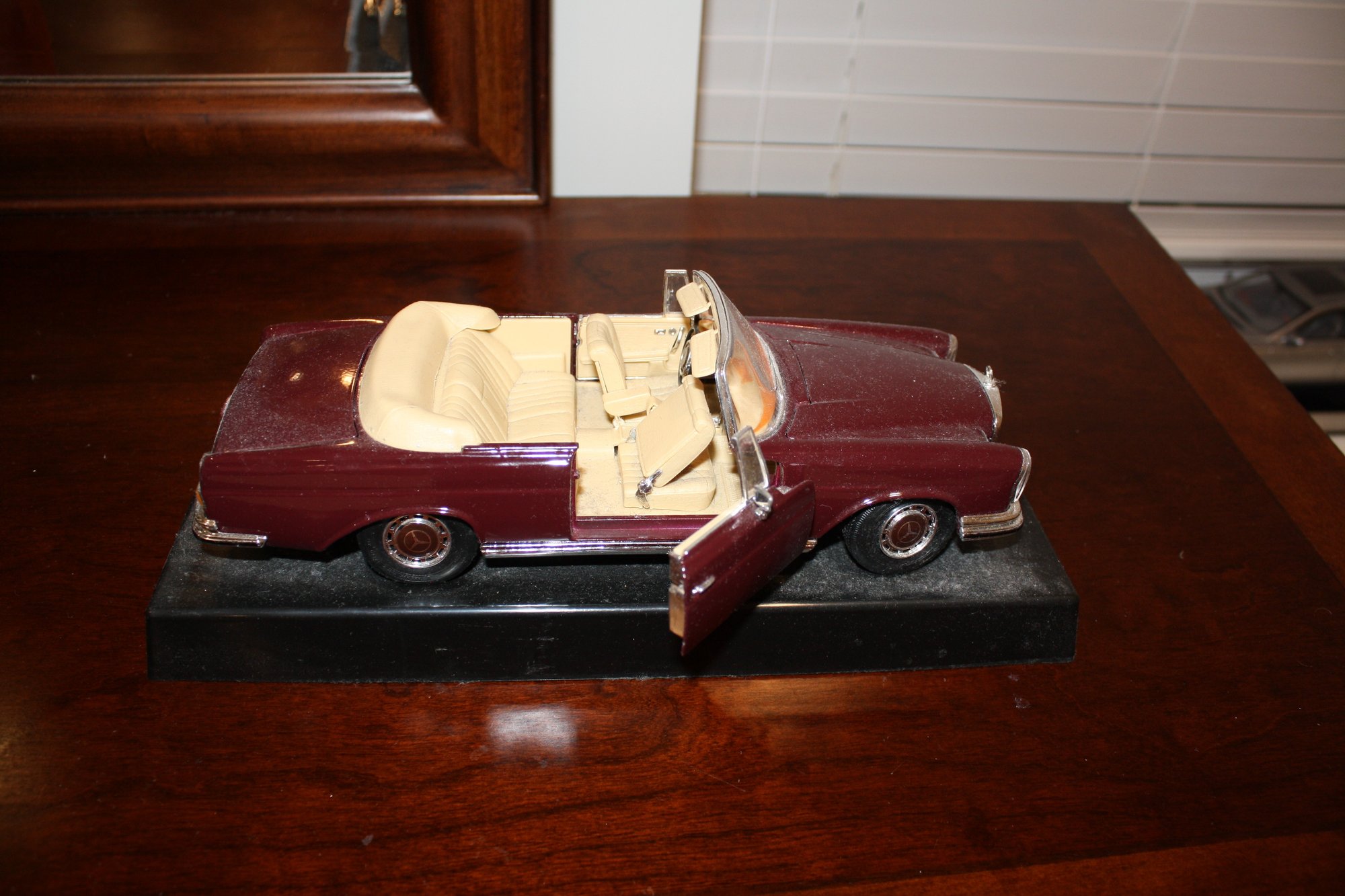 Maisto 1:18 scale die-cast model of a 1966 Mercedes-Benz 280SE convertible featuring a maroon exterior paired with a beige interior, detailed body styling with chrome-tone accents, realistic wheels, and finely crafted trim elements, presented on a display stand with model nameplate highlighting the classic luxury convertible design and collectible automotive replica craftsmanship.