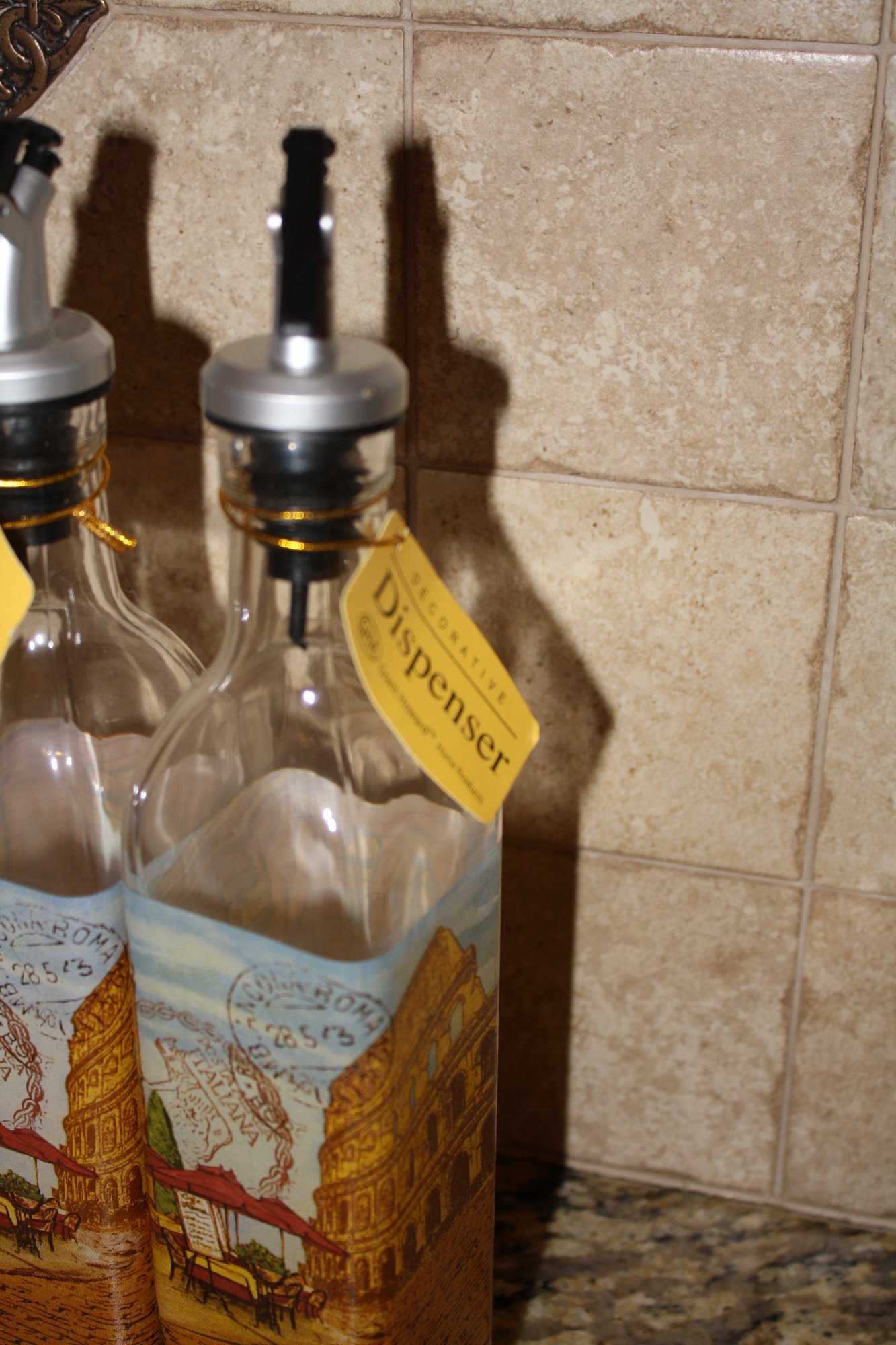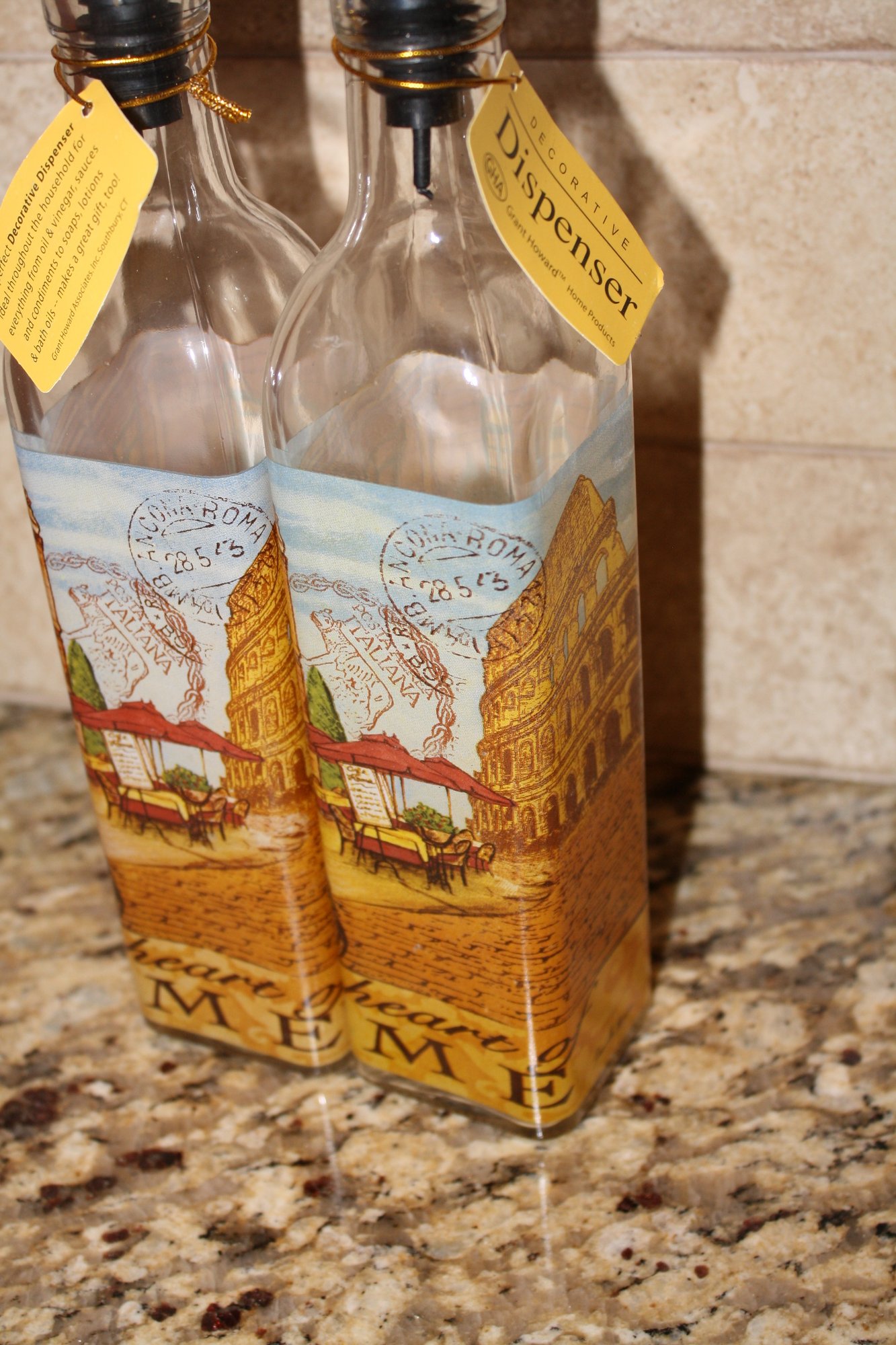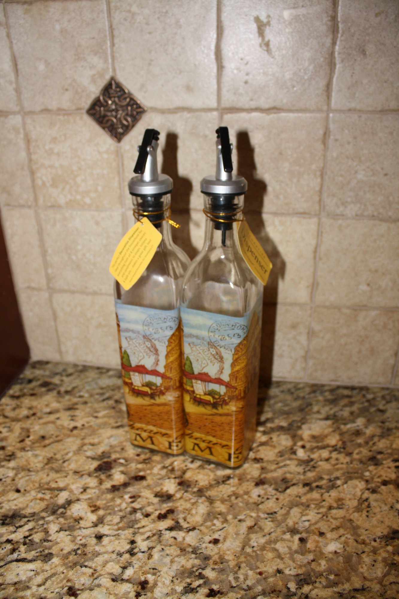 Set of glass oil and vinegar dispenser bottles featuring clear glass bodies decorated with Mediterranean-style scenes and equipped with stainless steel or chrome-plated drizzler spouts. The bottles include controlled pouring mechanisms to minimize spills, with a design suitable for storing and dispensing oils, vinegars, soy sauce, or other liquid condiments, combining decorative artwork with functional precision.