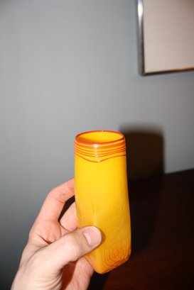 Hand-blown yellow and orange art glass vase featuring vibrant internal swirling patterns and distinctive red threading accents encircling the neck, executed in a modernist sculptural form characteristic of mid-century Scandinavian or Italian studio glass, with a fluid silhouette and richly layered coloration typical of art glass craftsmanship from Sweden or Murano traditions.