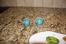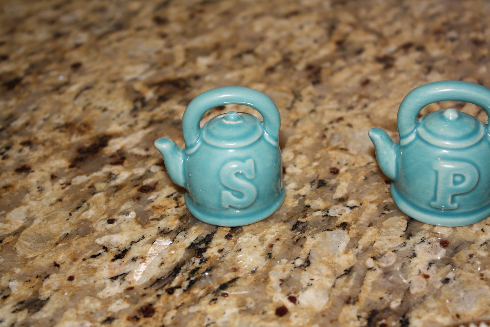 Miniature ceramic salt and pepper shakers shaped like teapots, featuring a teal or turquoise blue glaze with raised letters 'S' and 'P' on the front. The set showcases detailed molding and vibrant color, making it a collectible addition for display or tabletop use.