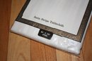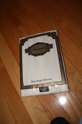Monticello satin stripe tablecloth measuring approximately 60 by 102 inches and designed in an oval shape. The fabric features a subtle woven stripe pattern with alternating satin and matte bands that create a refined tonal texture across the surface, forming a classic striped textile design integrated into the table linen.