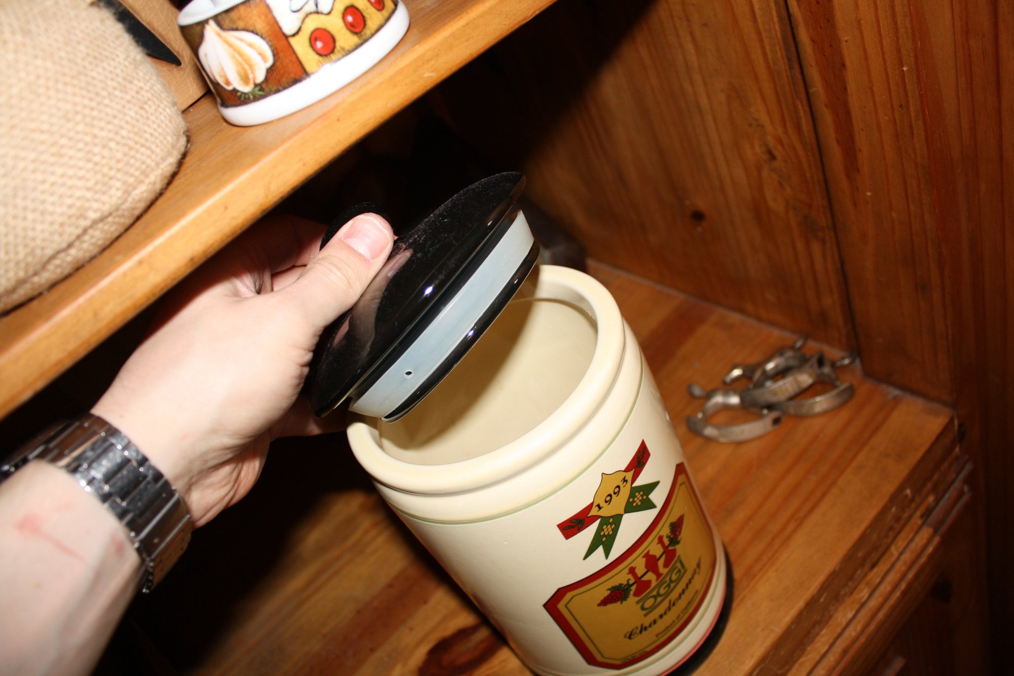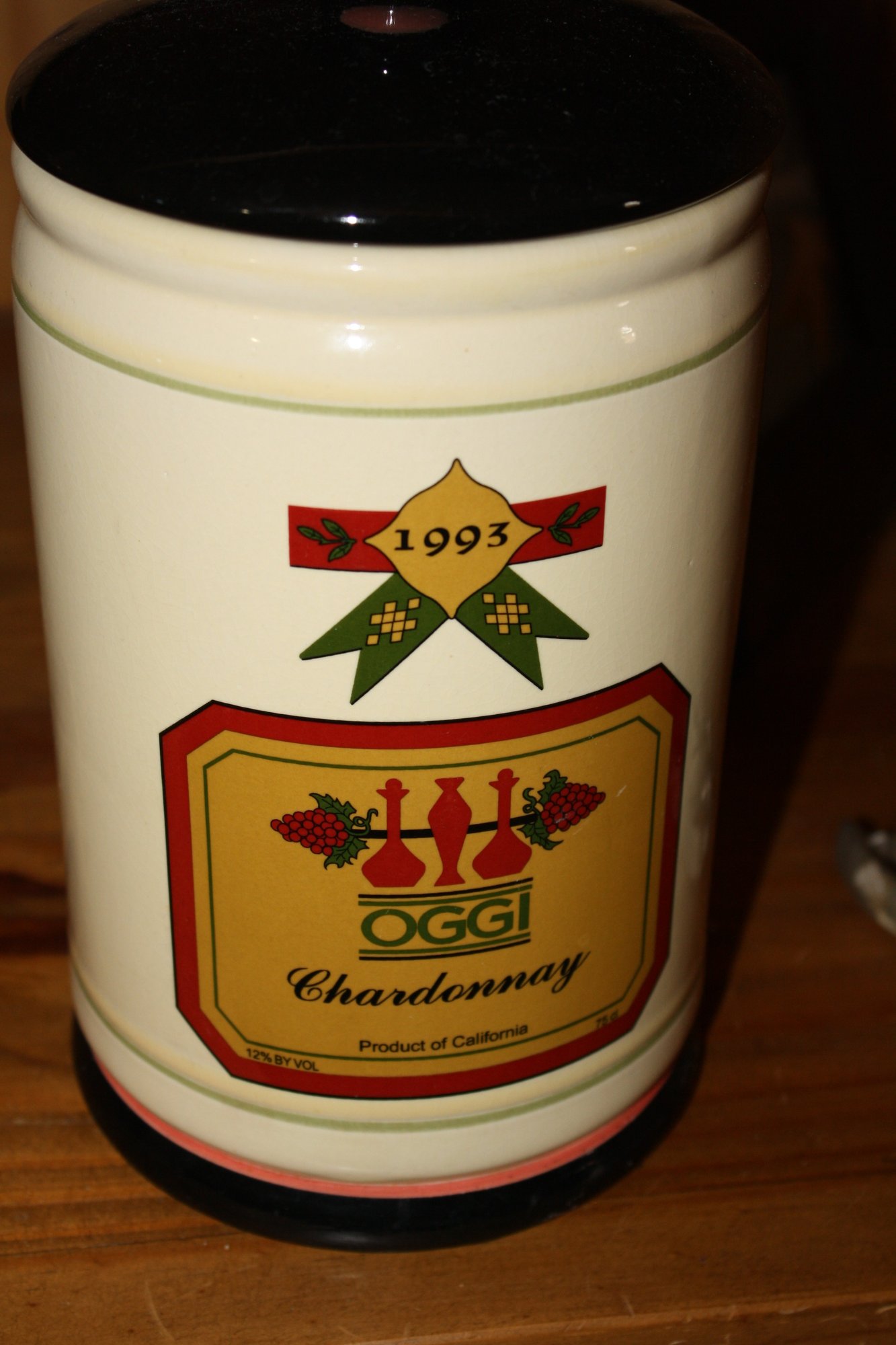 Collectible ceramic kitchen canister by Oggi Corporation, designed to resemble a 1993 vintage Chardonnay wine bottle. Features a detailed label and a removable lid, ideal for storing dry ingredients or as a decorative accent in wine-themed kitchens. Often part of a collectible set, combining functional storage with whimsical wine-inspired décor.