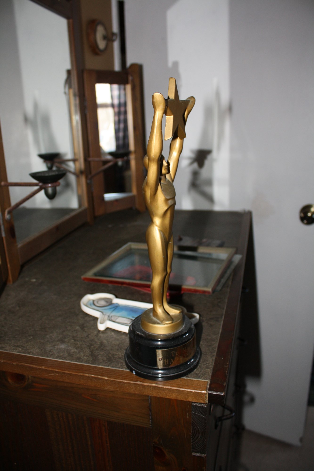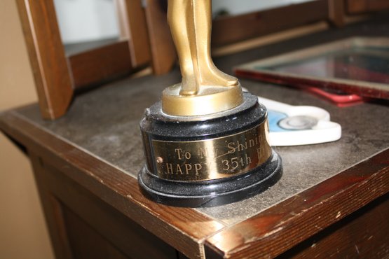 Decorative collectible trophy featuring a gold-colored figure atop a black pedestal base, styled like the Academy Award. Made from plastic, the statuette includes a personalized inscription reading “To My Shinin HAPPY 35th B.” Ideal as a novelty award, party decoration, or humorous gift for special occasions.