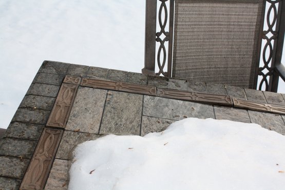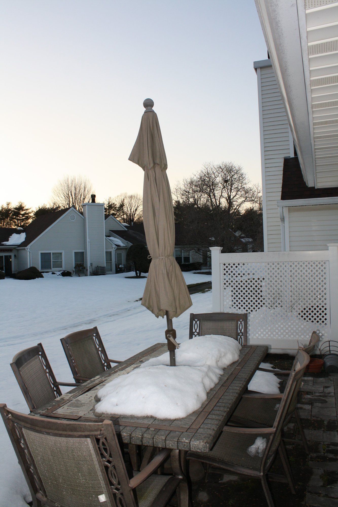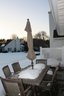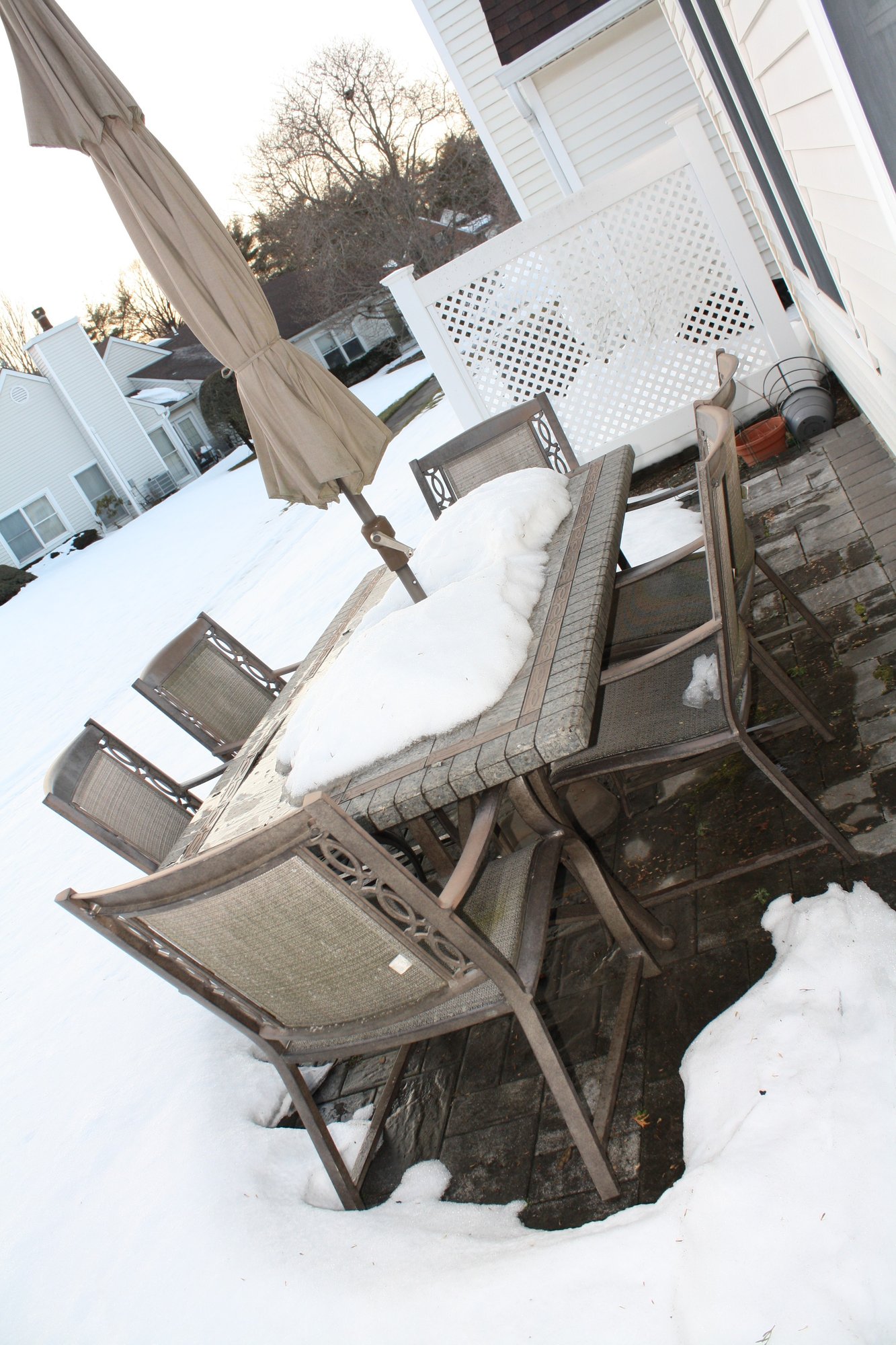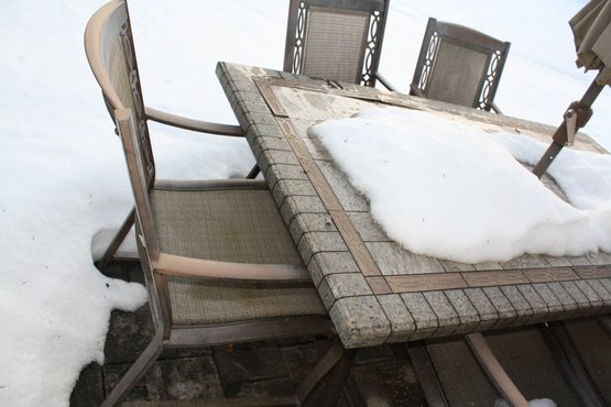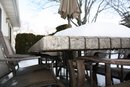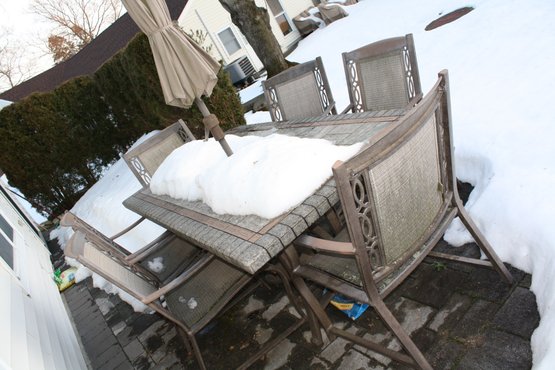 Outdoor patio dining set featuring a rectangular table with a tabletop measuring approximately 42 x 79.5 inches and a height of about 28 inches, paired with coordinating patio chairs and a beige market-style umbrella mounted through the center opening of the table, presenting a classic outdoor dining arrangement with a large rectangular surface and matching seating.