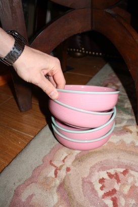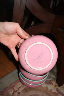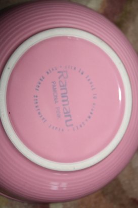 This is a set of four Ranmaru Pamona Pink dinner plates crafted from stoneware in Japan. The plates feature the discontinued Pamona Pink pattern with a subtle green rim, combining vintage charm with functional tableware. Each plate measures approximately 11 inches in diameter and is suitable for everyday use or as a collectible addition to a Ranmaru dinnerware collection.