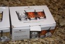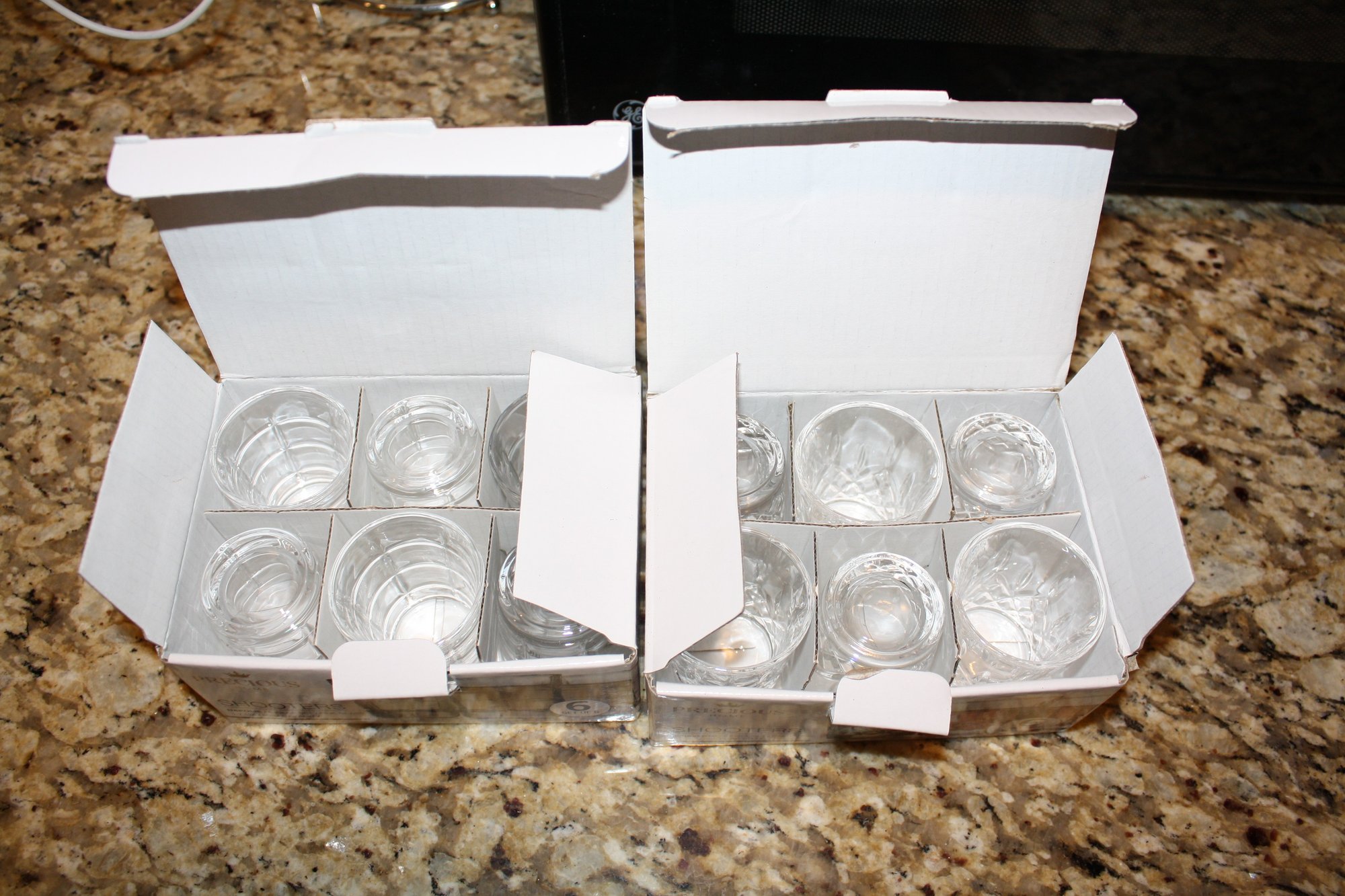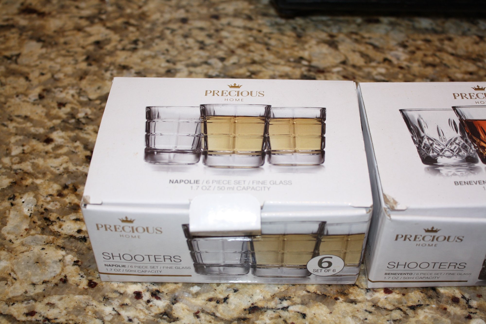 Precious Home glassware sets featuring 6-piece shot glasses in the Napolie and Benevento styles, crafted from clear glass with smooth rims and solid bases. Each set showcases distinct design elements reflecting the respective style, combining elegant shapes and decorative touches for a refined tabletop presentation.