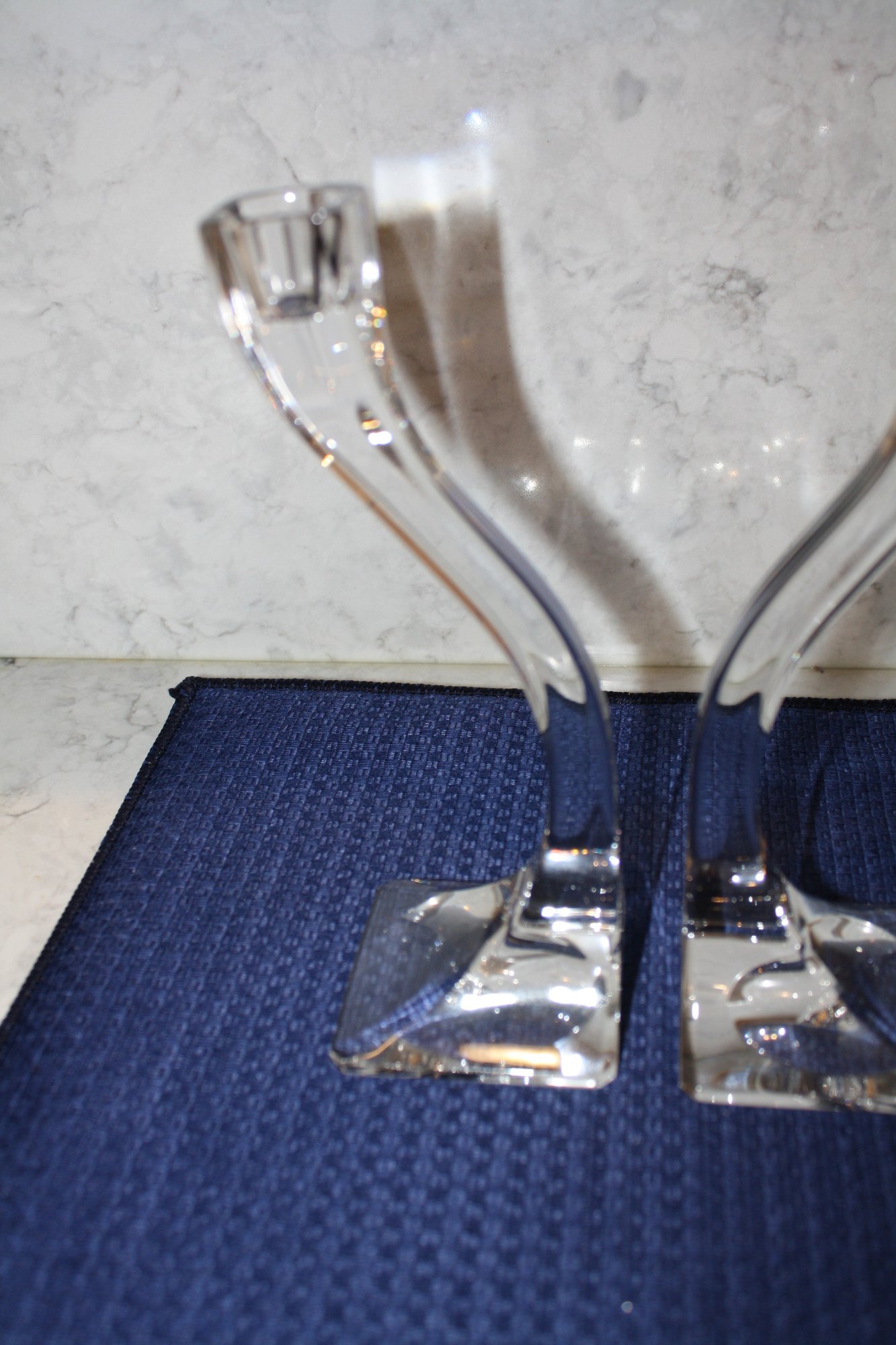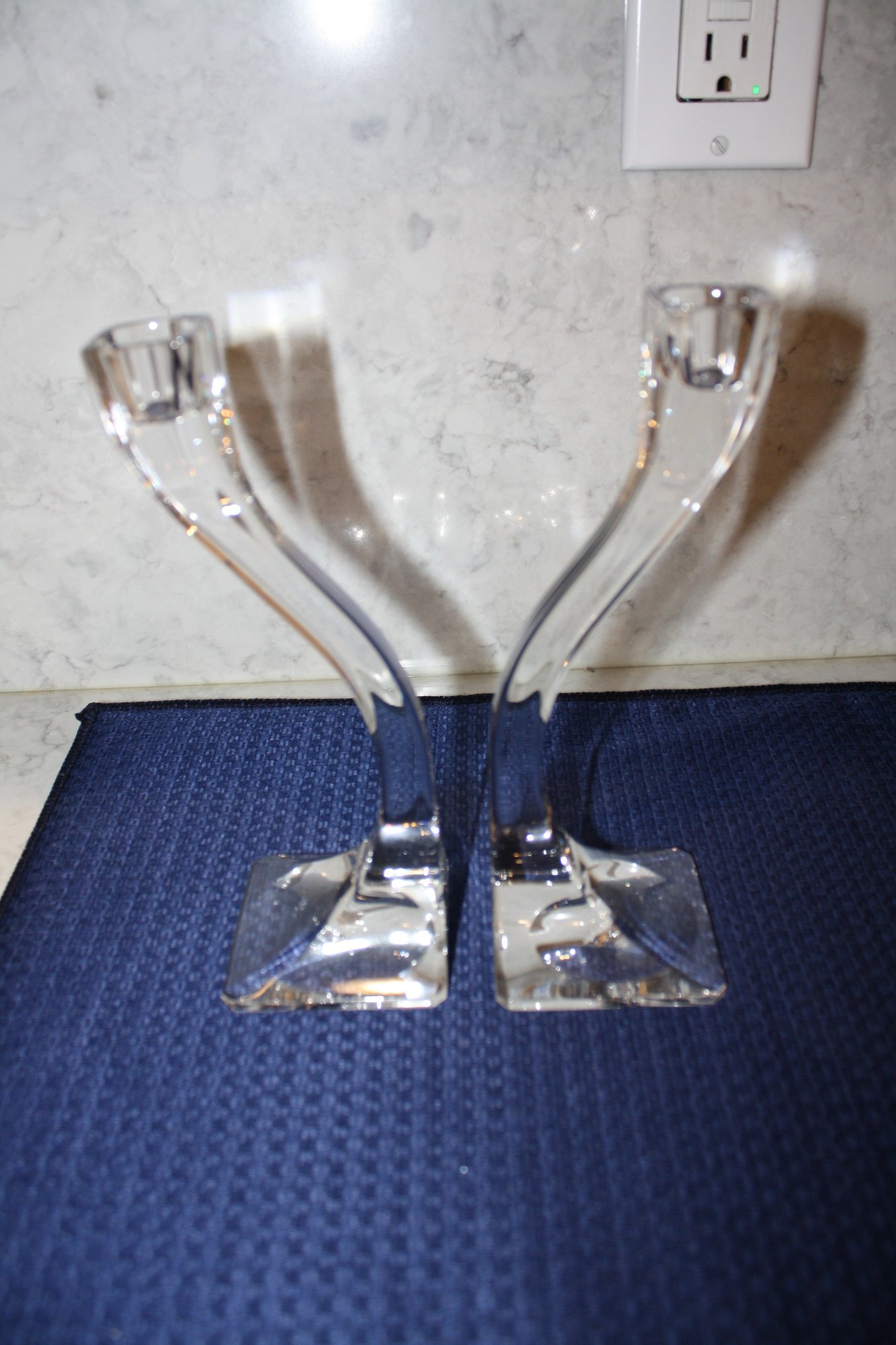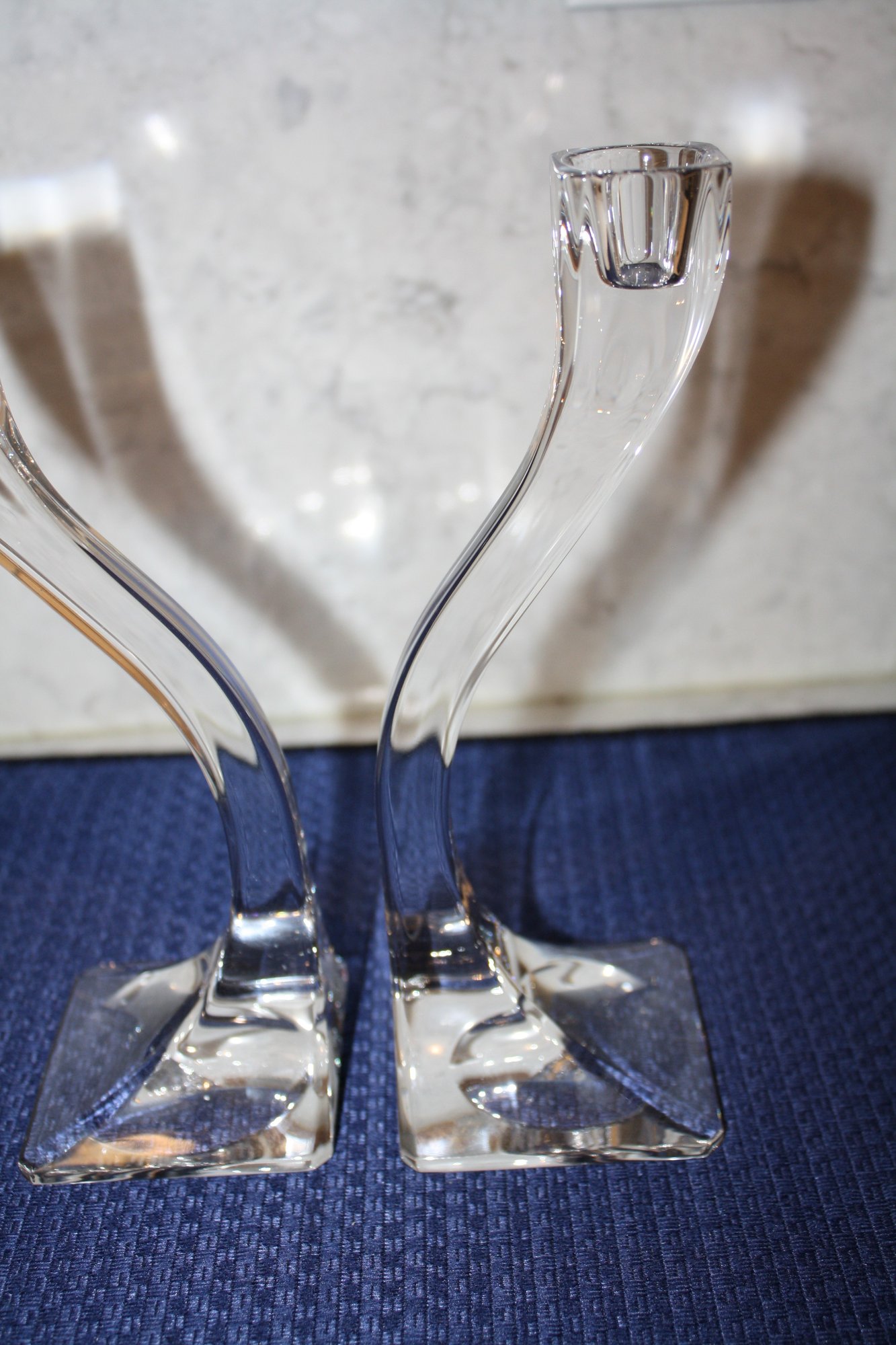 Pair of vintage Riedel “Duetto” crystal candlestick holders designed by Claus Josef Riedel and manufactured in Austria before 1990, featuring an abstract curved form in high-quality crystal designed to create a prismatic light reflection effect, 8" tall