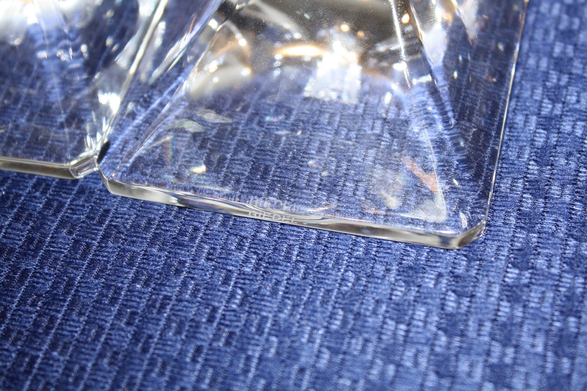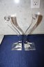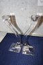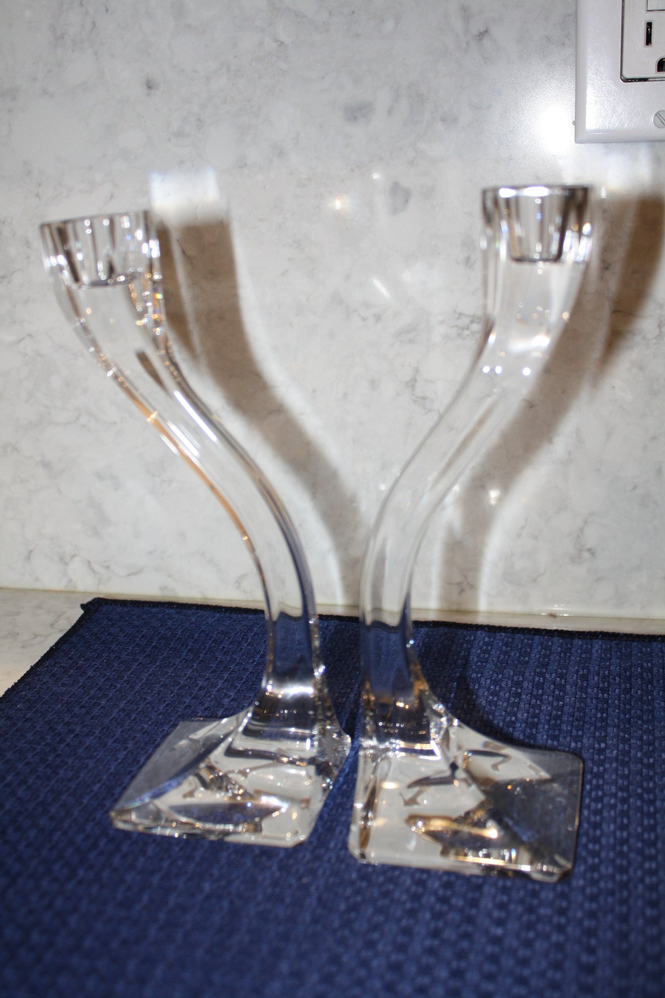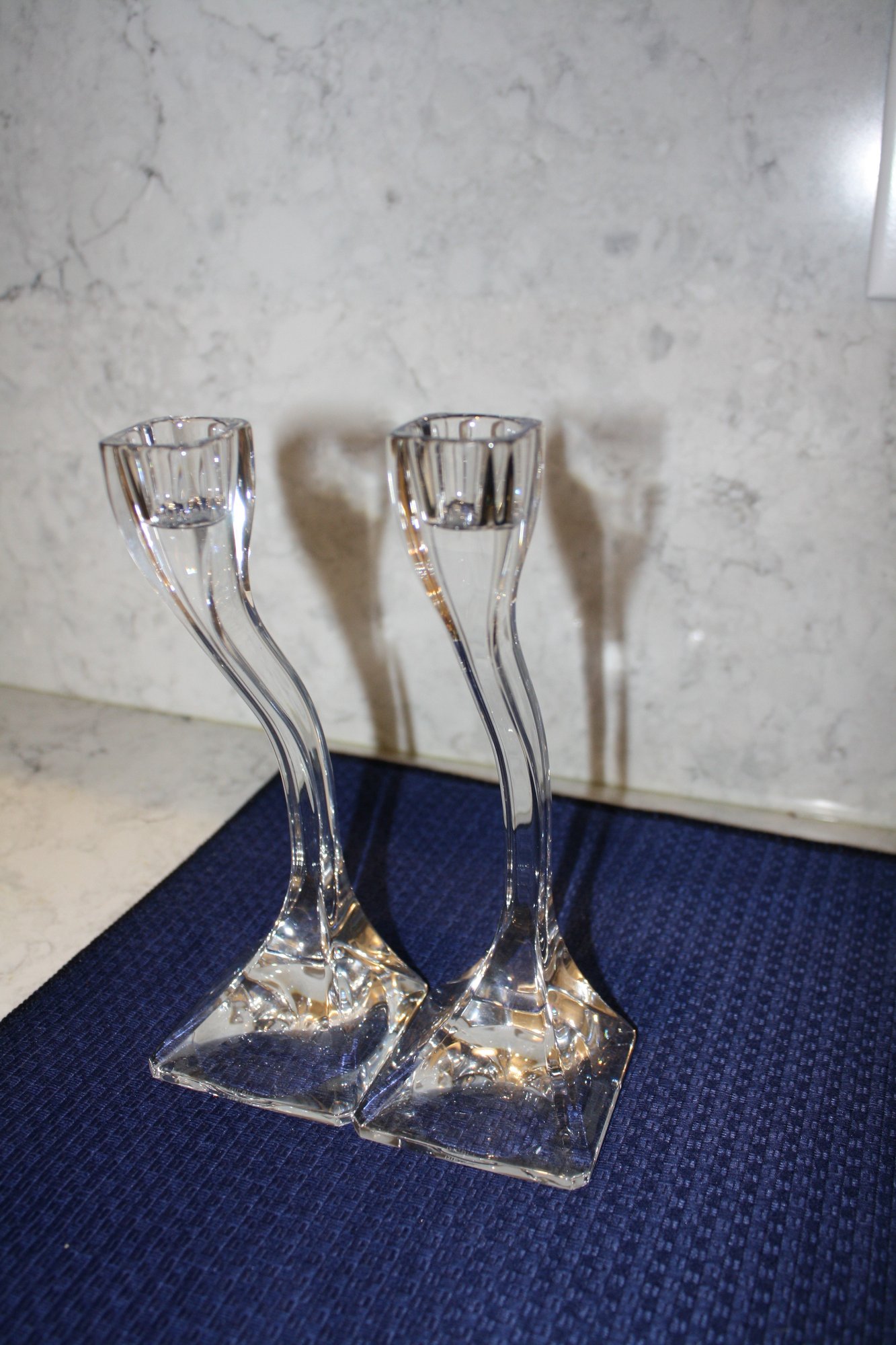 Pair of vintage Riedel “Duetto” crystal candlestick holders designed by Claus Josef Riedel and manufactured in Austria before 1990, featuring an abstract curved form in high-quality crystal designed to create a prismatic light reflection effect, 8" tall