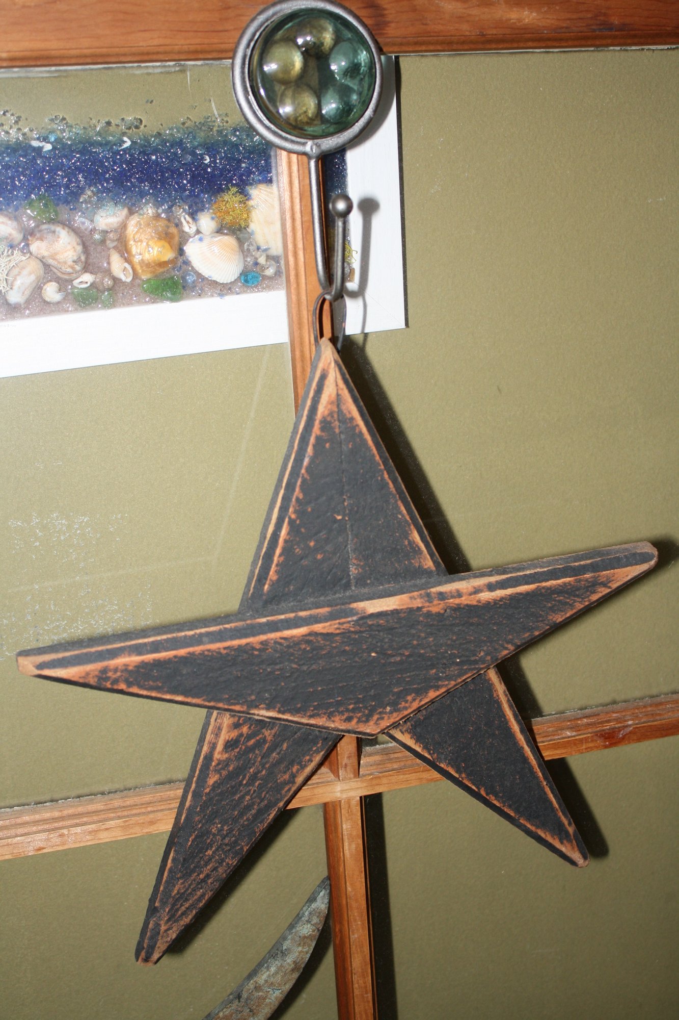 Primitive black wood star designed as a rustic farmhouse or country-style wall accent. Ideal for indoor spaces, adding a touch of vintage charm or rustic décor to living rooms, entryways, or kitchens.