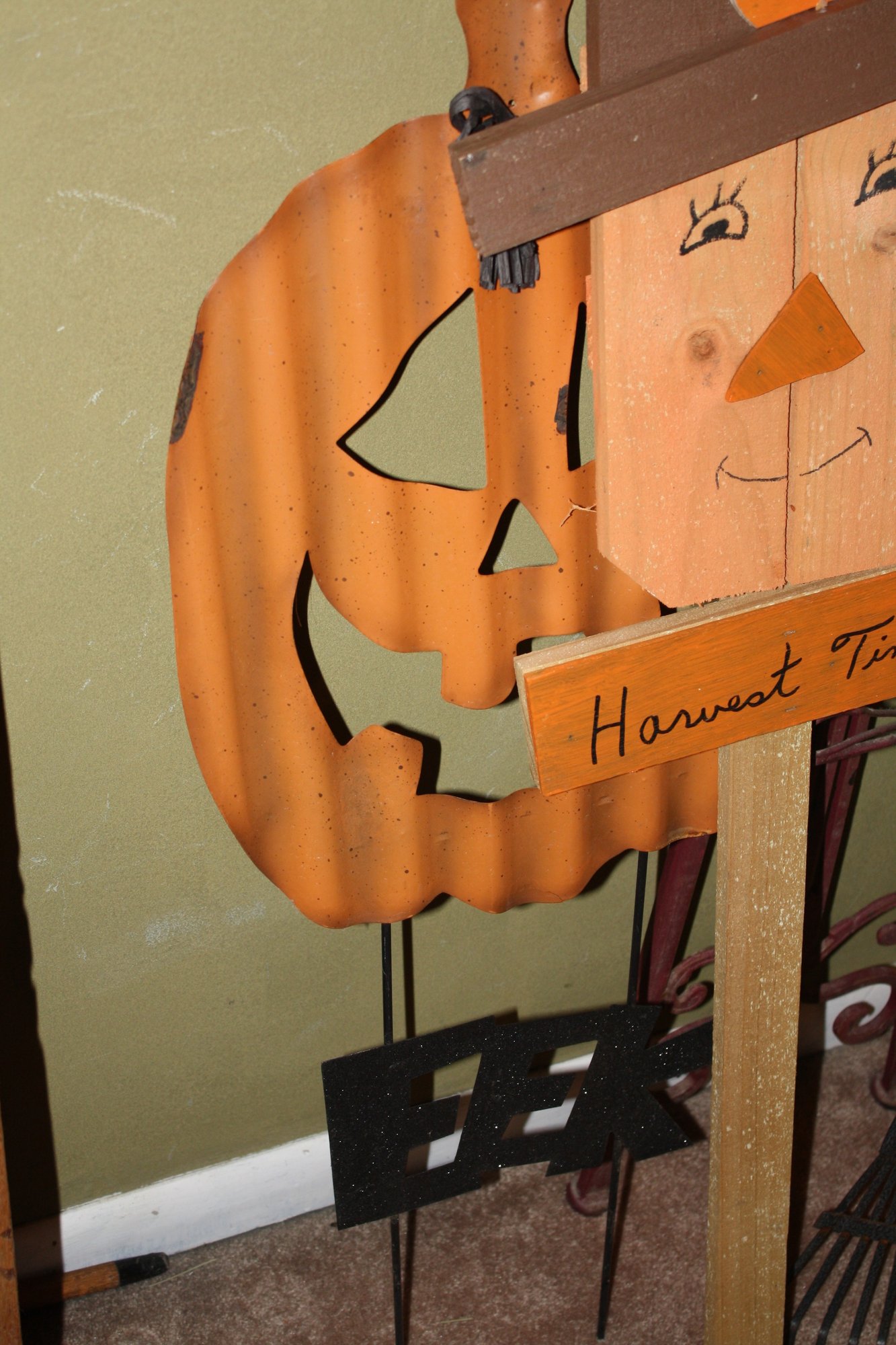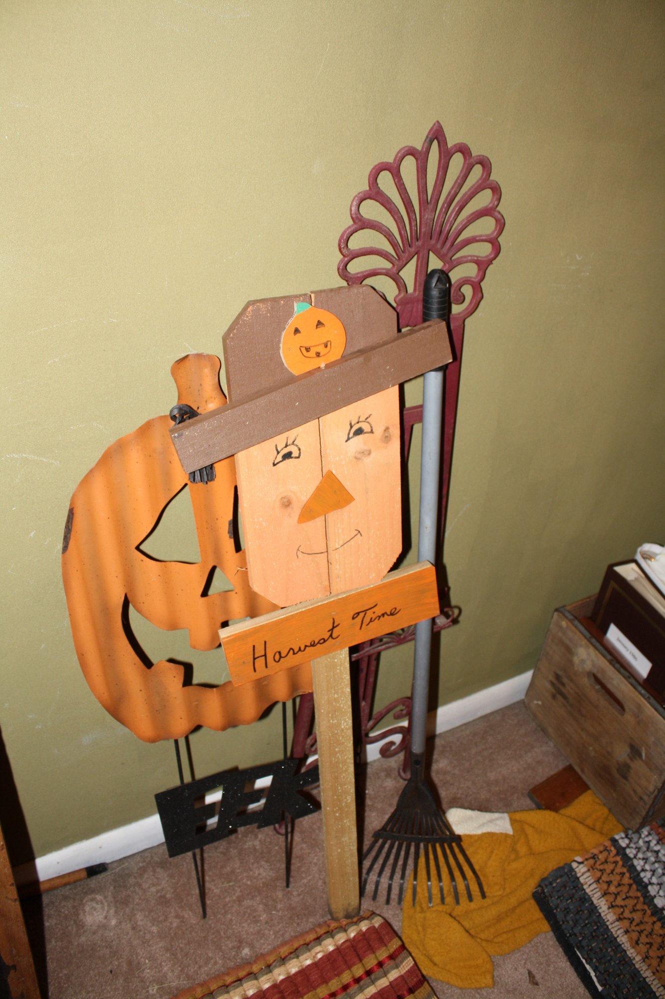 Decorative primitive wooden scarecrow stake, ideal for autumn or Halloween-themed home décor. Can be placed in gardens, flower beds, or entryways to add a rustic seasonal touch. Handcrafted style adds charm to rustic, farmhouse, or harvest displays.