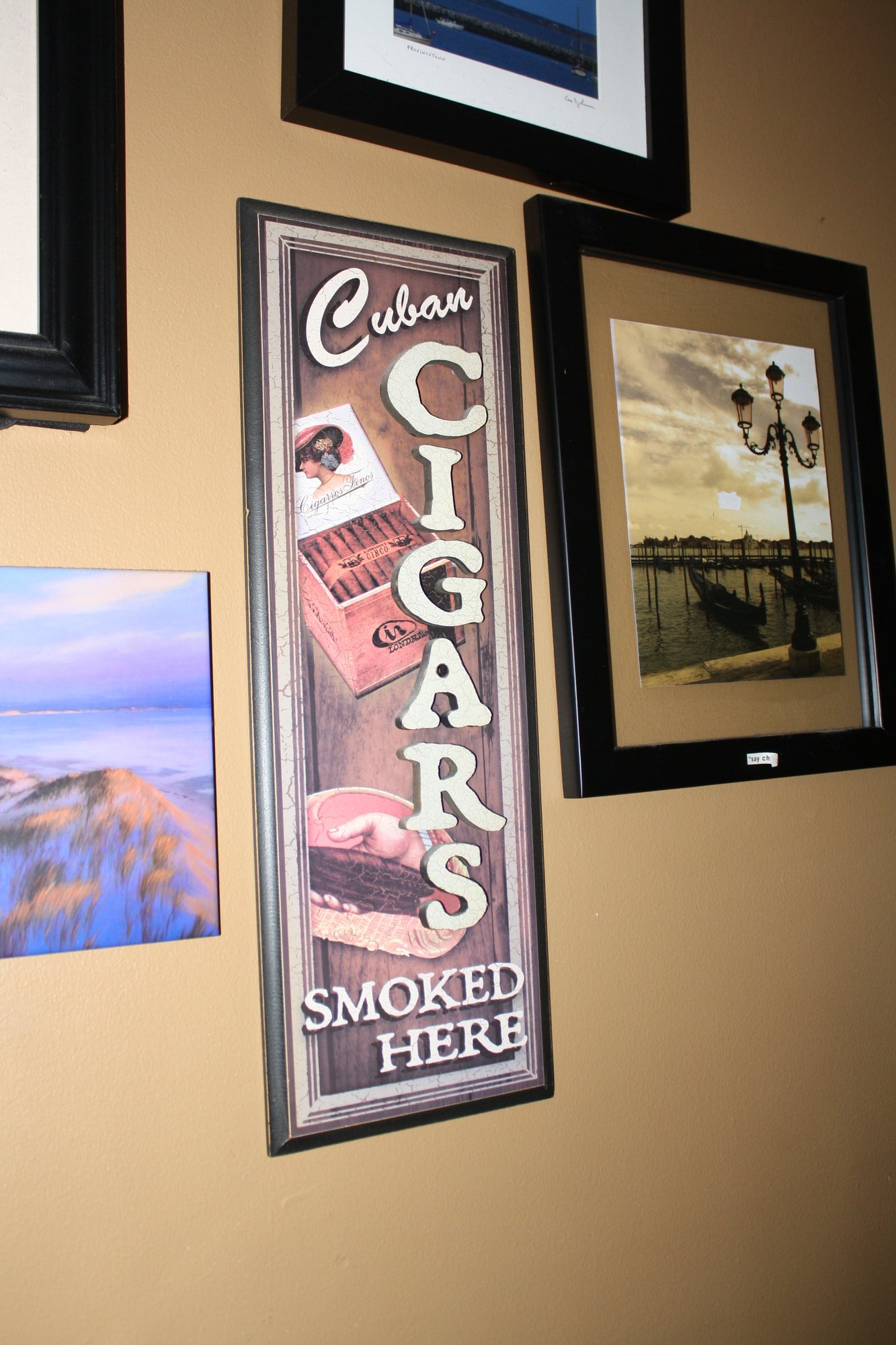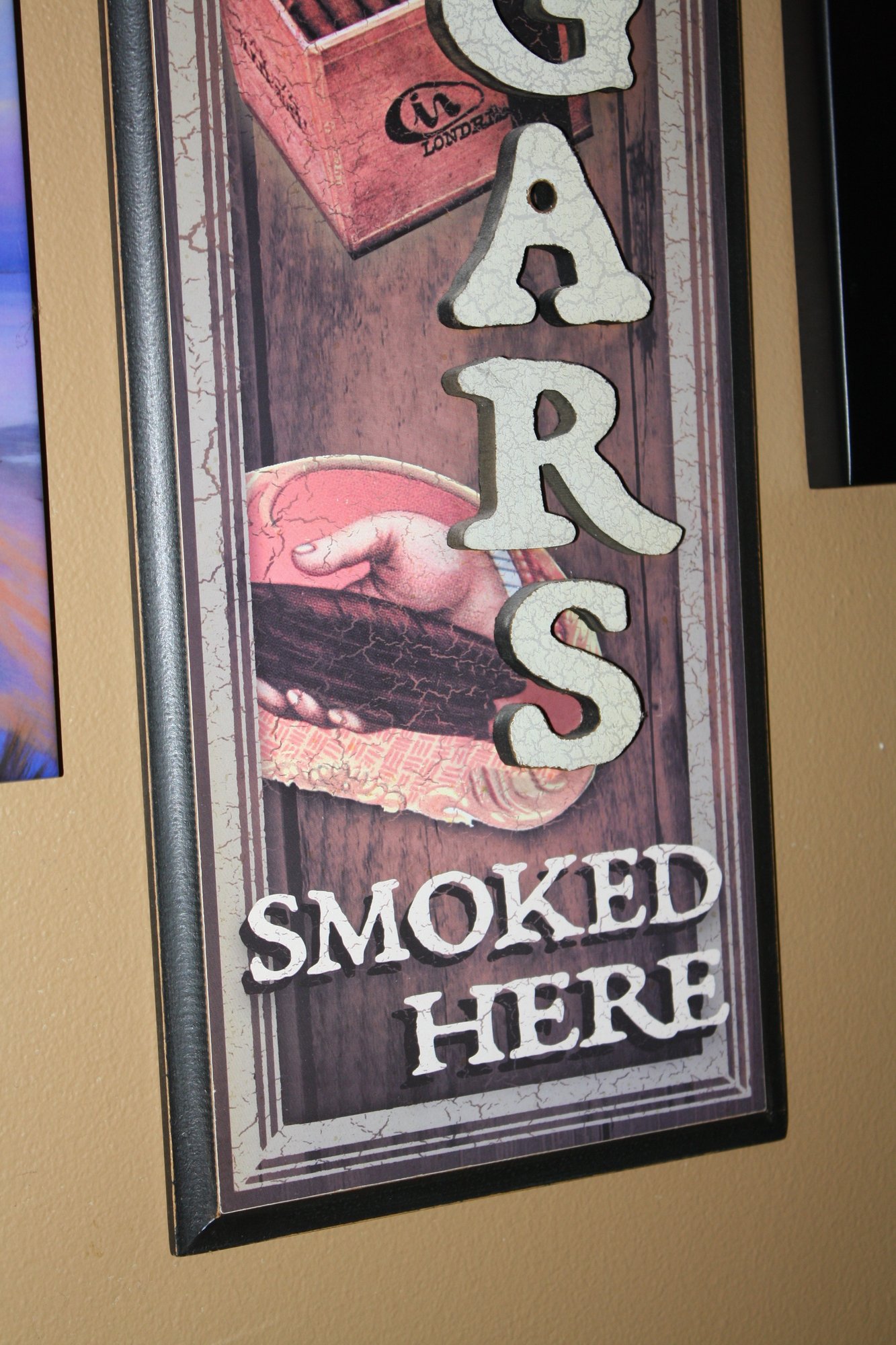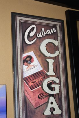This rustic metal sign reads “Cuban CIGARS SMOKED HERE” and features a hand holding a lit cigar alongside a cigar box illustration. Designed for a lounge, bar, or smoking area, it adds vintage charm while indicating that Cuban cigars are enjoyed on the premises.21" tall
