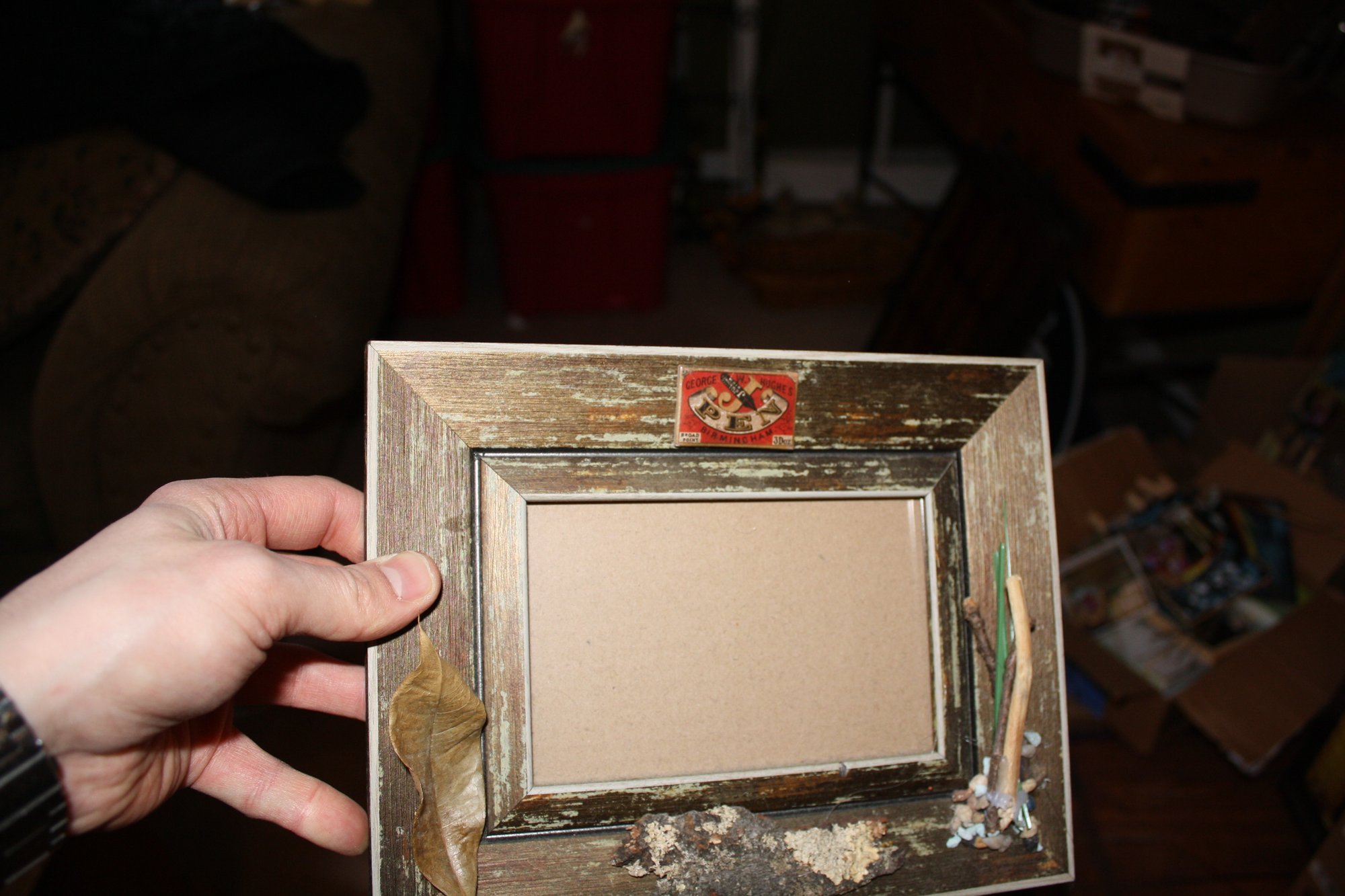 Decorative picture frame featuring a rustic, distressed wooden design with natural-inspired accents such as a small leaf and bark or twig details. Ideal for displaying photos, art prints, or tabletop décor with a farmhouse, woodland, or nature-inspired aesthetic. Durable construction suitable for tabletop or wall display.