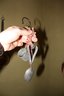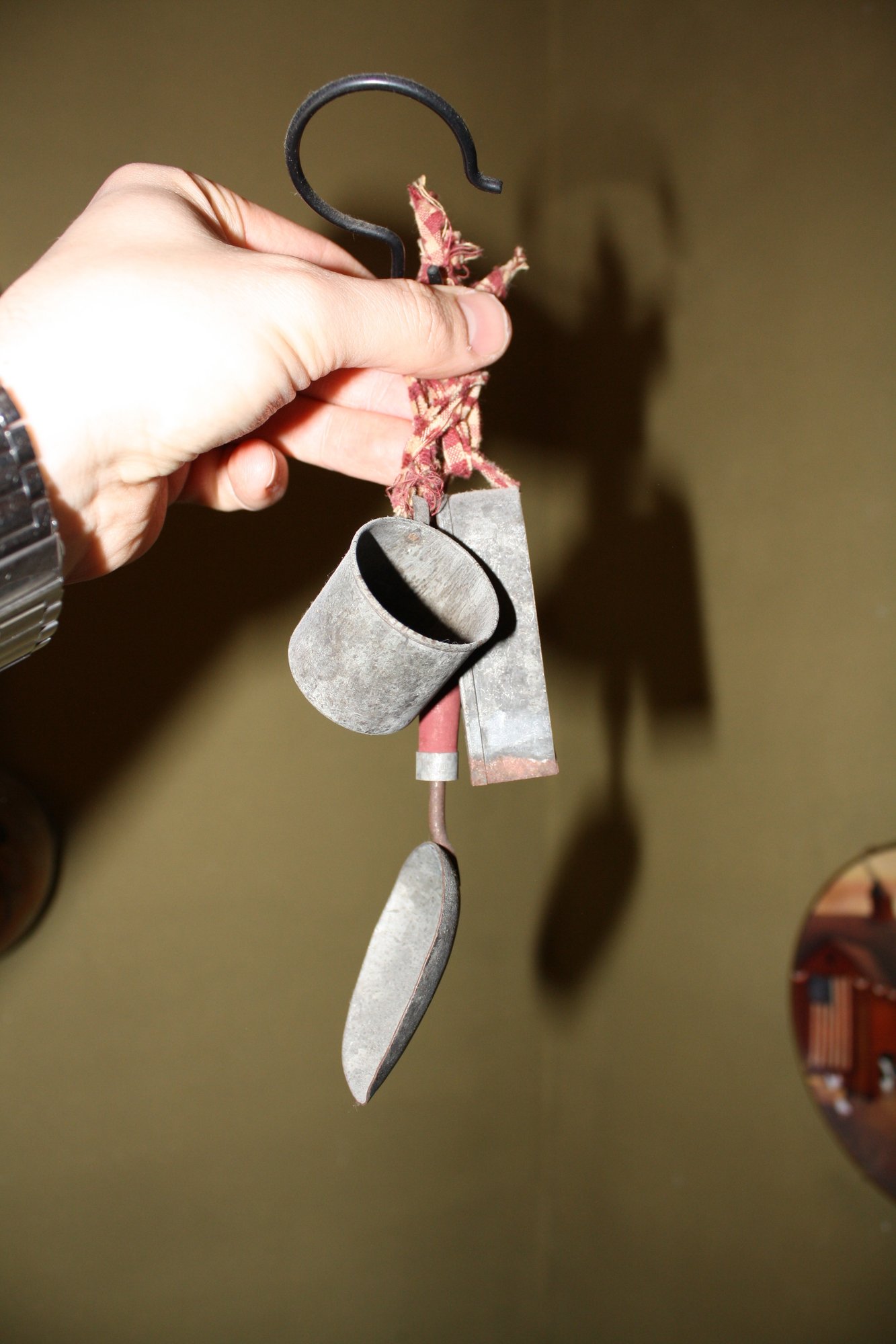 Vintage or rustic handmade hanging ornament featuring a miniature spoon, small cup, and heart-shaped metal piece suspended by red and white twine from a black metal hook. Crafted from repurposed metal cutlery and household objects, designed as charming décor for kitchens, patios, or gardens. Adds whimsical, rustic charm to any home display.